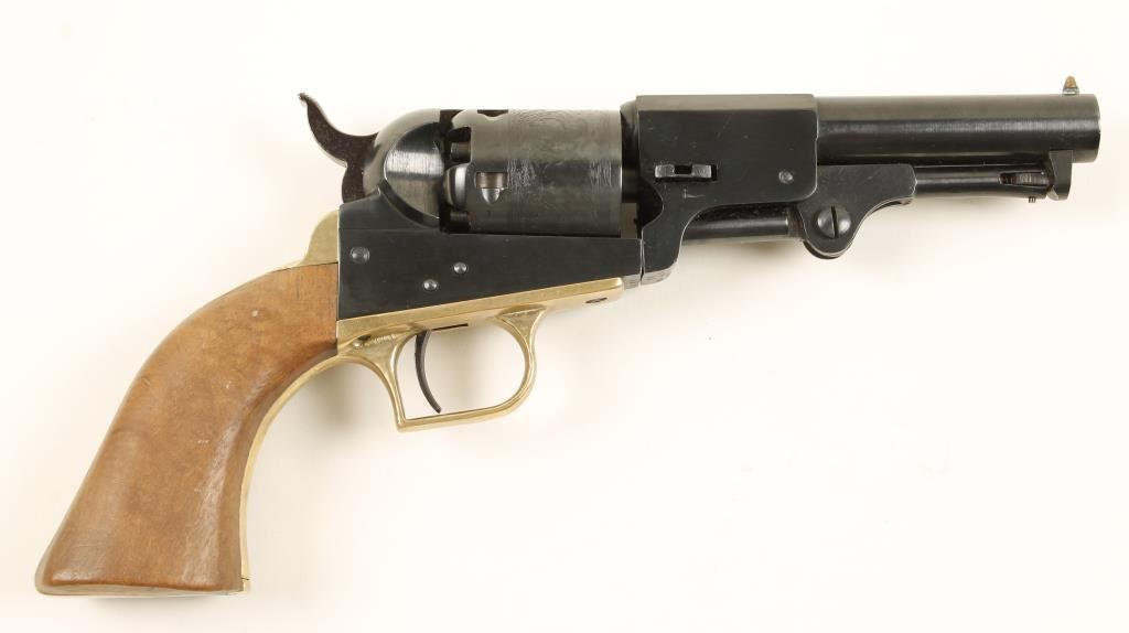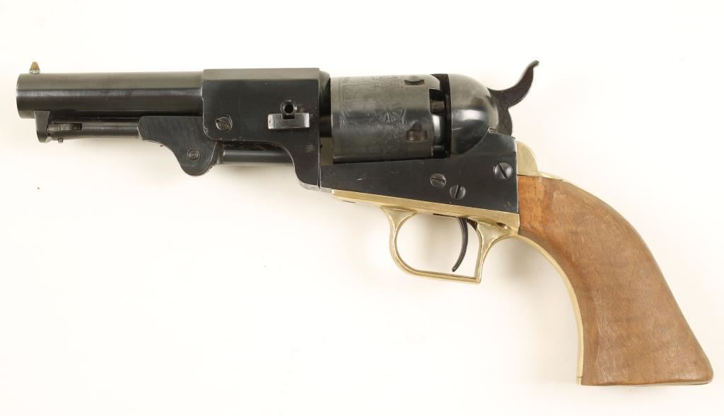 Replica blued and brass single-action 5-shot percussion open-top revolver with a 4" barrel. Cylinder has roll-stamped stagecoach hold-up scene. Wedge retaining screw is missing. Bluing has some scratches and a few dings. Brass square-backed trigger guard and the backstrap have some scratches. Bore has strong rifling and some areas of rust. Three of the chambers have rust. Wood grips appear crude with dings and scratches. Action is tight with solid lock-up. Condition is fair to good. *Antique Firearm*