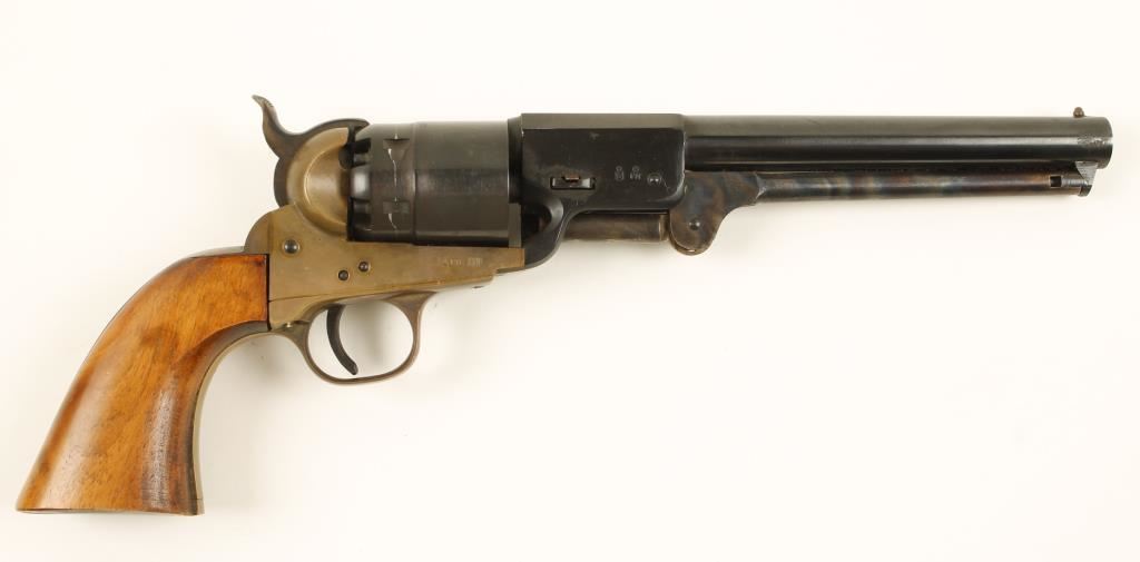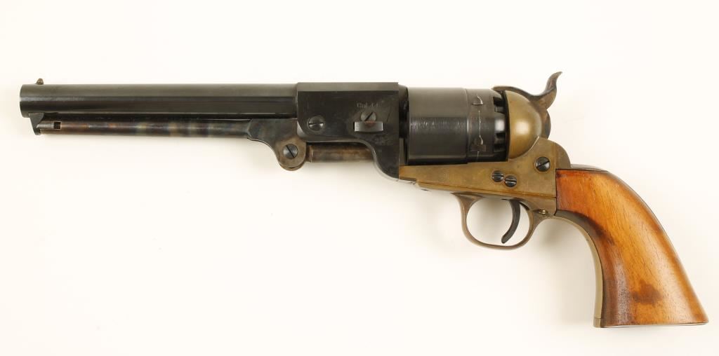 Replica blued, brass and case-colored single-action 6-shot open-top percussion revolver with a 7-5/16" barrel. Made for Navy Arms. Blued barrel, cylinder, screws and trigger have a few scratches and a drag line. Case-colored loading lever and hammer have machining marks and tiny rubs. Brass frame, trigger guard and backstrap have tiny scratches. Bore and chambers are immaculate. Wood grips are a poor fit well inside the frame edges and show sanding marks, varnish runs and dings. Action is good with tight lock-up. Condition is good to very good.