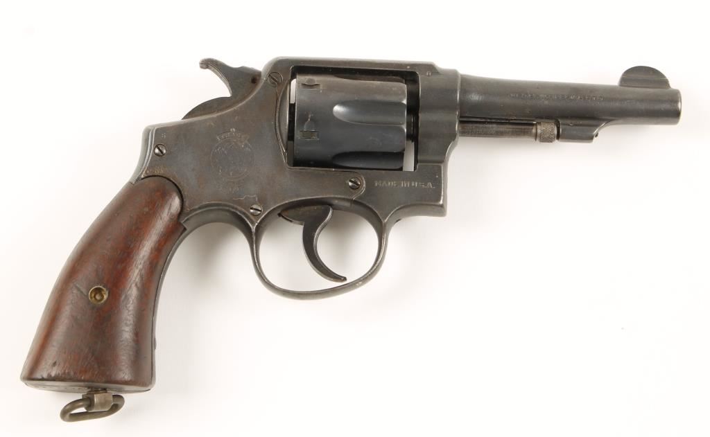 "Black Magic" finish double-action 6-shot revolver with a 4" barrel. Finish may be re-finished and is 90% intact with some areas of rust spotting. Has import marks. Stamped "U. S. Navy" on topstrap. Grips are smooth wood with no medallions. Action is loose but good. Bore is bright and shiny with good rifling. Chambers are shiny. Condition is good. *Modern Firearm*