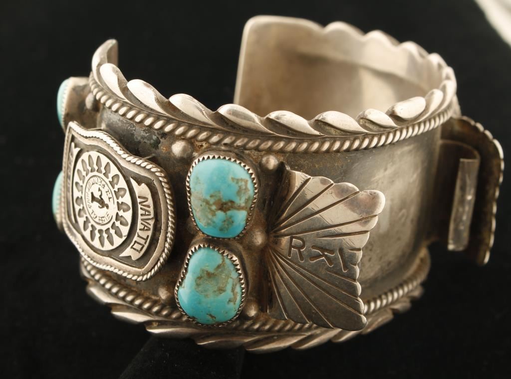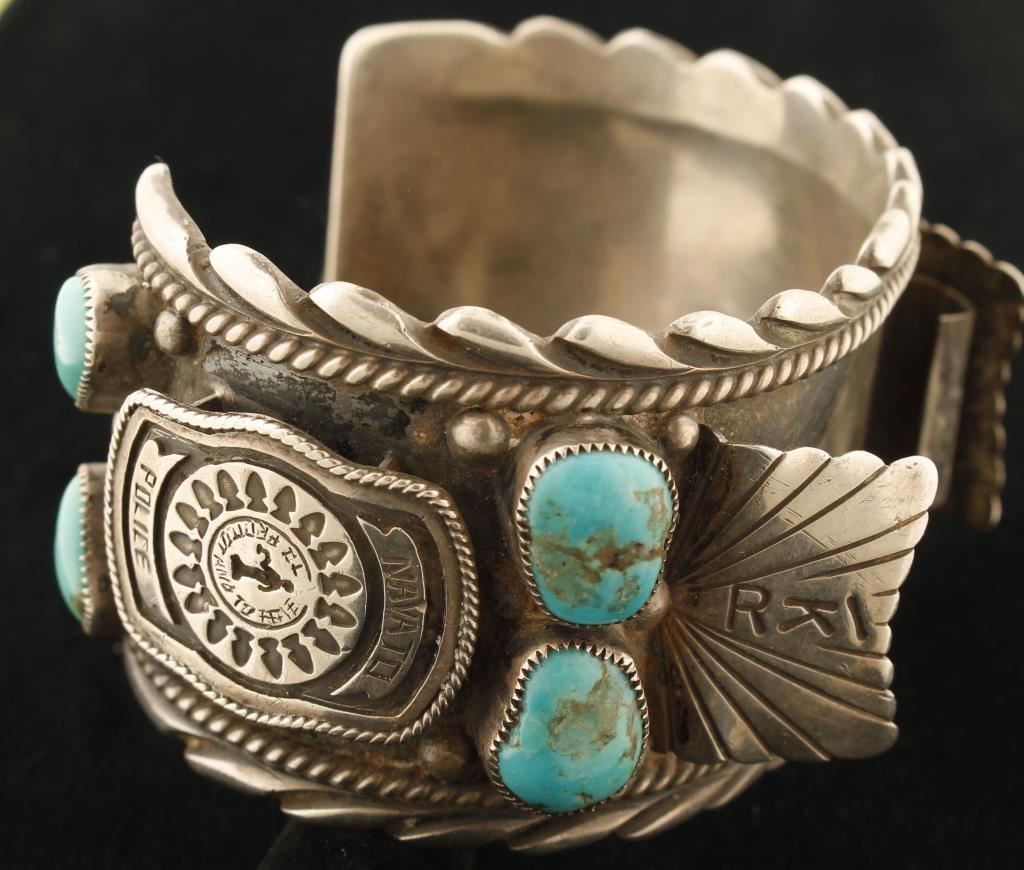 Marked Navajo Police and signed 'L.D.' 1950's to 60's. High quality turquoise. Owner's initials R.K. on attachments. Made by one family member for another who was Navajo Police by tradition. RARE and probably one of a kind.