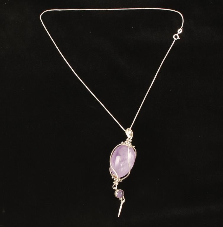 Silver. The focal point of the pendant is a 70+ carat amethyst crystal. The crystal is encircled by a very artistic setting to securely hold the gemstone. It is accented with another amethyst suspended at the bottom. Amethyst is a spiritual stone, with no negative side effects. It is a stone of peace. It calms fears, raises hopes, lifts the spirits, and promotes thoughts of the spiritual reality behind our lives. It ward off guilt and self deception, curbs overindulgence, and bestows good judgment. It calms emotional storms and in situations of potential danger, it will come to your aid. It also lends courage and is a powerful amulet for travelers. Worn, it protects against thieves, harm, sickness, and danger. The pendant comes with an 18" sterling silver box link chain. Truly a statement piece.