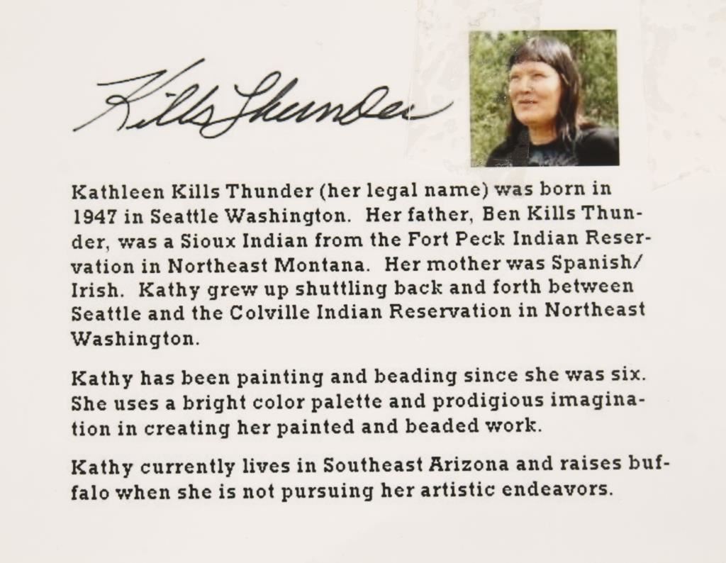 Handmade by noted Sioux artist Kathleen Kills Thunder, signed on base 10"X5".Kathleen was born in 1947 in Seattle Washington. Her Father, Ben Kills Thunder, was a Sioux Indian from the Fort Peck Indian Reservation in Northeast Montana. Kathleen is well known for her painting and beading, always done in a bright colorful way. She currently lives in Southeast Arizona and raises buffalo and continues to produce beautiful art.