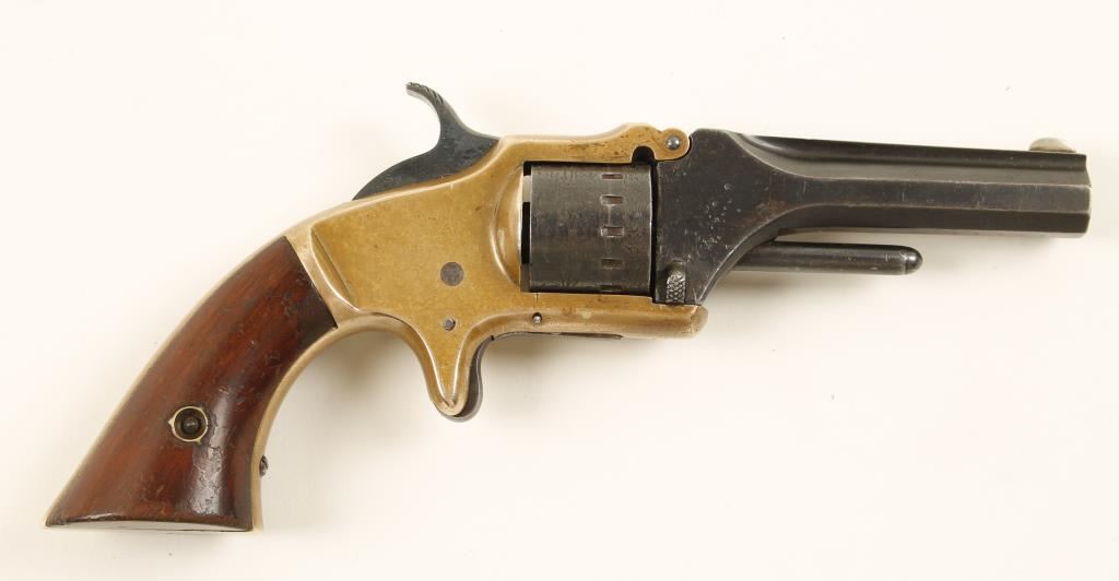Single-action 7-shot spur-triggered rimfire black powder revolver. Blued barrel, hammer, trigger and engraved cylinder. Brass frame has scratches and dings. Wood grips have a small chip missing as well as a variety of dings and rubs but they are well-fitted and tight. The action does not work. The barrel is loose and wobbly in the pivot. Finish is good Function is poor. *Antique Firearm*