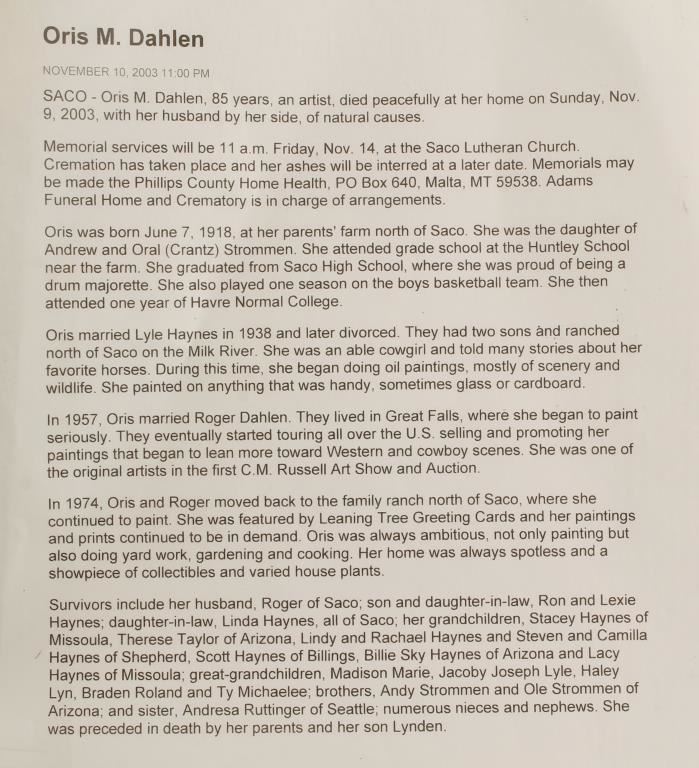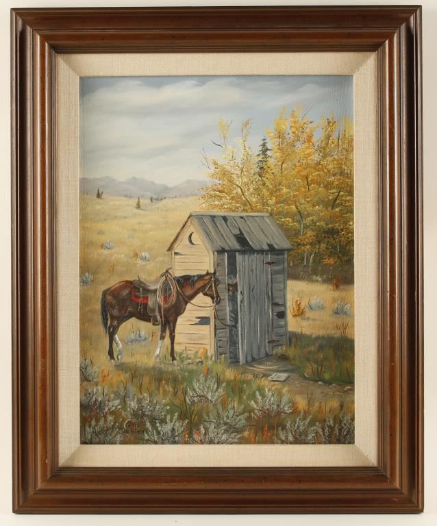 by Artist Oris Dahlen. Born in 1918 on a ranch north of Saco, Montana. She was an able cowgirl and loved talking about her favorite horses. This painting depicts a beautiful rural landscape with a saddled working cow horse waiting while the cowboy is using the rustic old courthouse. The Artist signature, Oris Dahlen, is in the bottom left corner. Measures 17 1/2" wide x 21 1/2" tall and is in excellent condition with no signs of damage or exposure.