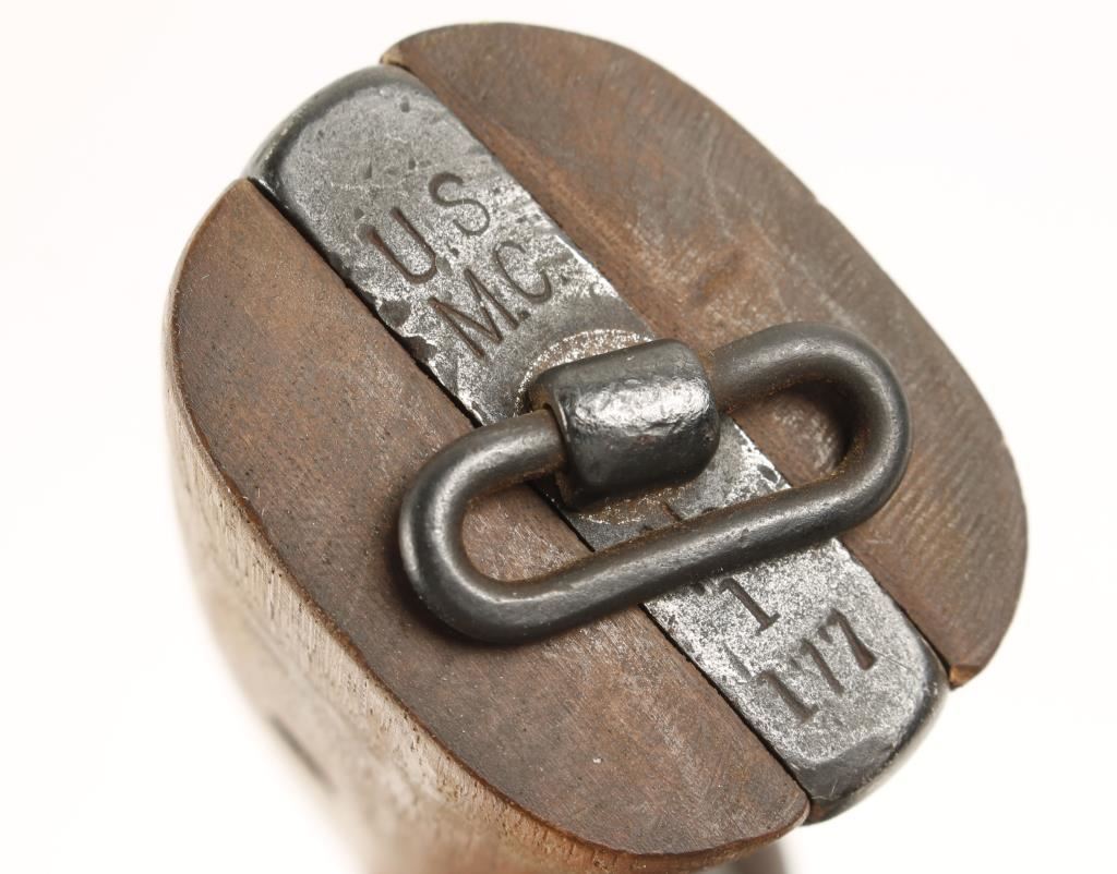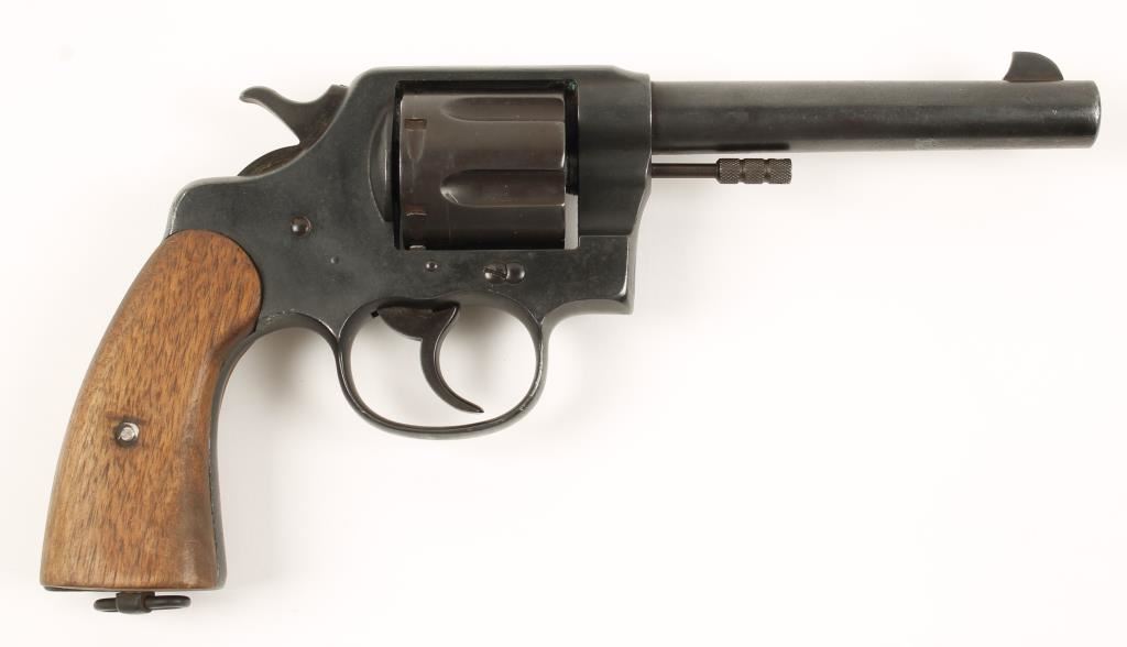 Marked "USMC" and "No 1" and "177" on butt. Blued double-action 6-shot revolver with a 5-1/2" barrel. Frame is flat black and barrel is worn but shiny with dings and light pitting. Bore is shiny grey with good rifling. Chambers are dirty but fine. Wood grips are plain, smooth replacements but they fit well. Action functions well. Condition is fair.