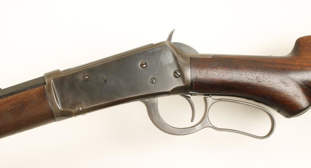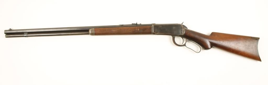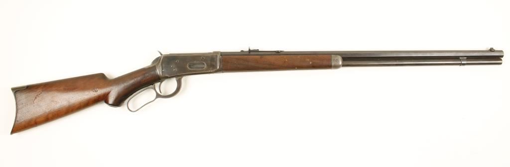 Blued lever action rifle with a 26" octagon barrel and a full-length magazine. Special order item. Barrel has strong bluing with sharp edges and a few tiny areas of surface rust, pitting and tiny dings. Magazine tube is faded with some old pitting, dings and scratches. Receiver has faded to a blue/brown patina with a few tiny scratches and rubs. Half pistol grip stock has some deep dings, a small chip by lower tang and lighter scratches/rubs. Forend has rounded edges, dings, scratches and scrapes. Crescent butt plate and forend cap are worn to grey with light pitting and small scratches. Grip cap is worn so it is difficult to read the "Winchester Repeating Arms Co." on it. Bore is frosty with little remaining rifling. Action is tight but trigger block safety doesn't work. Condition is fair to good. *Antique Firearm*