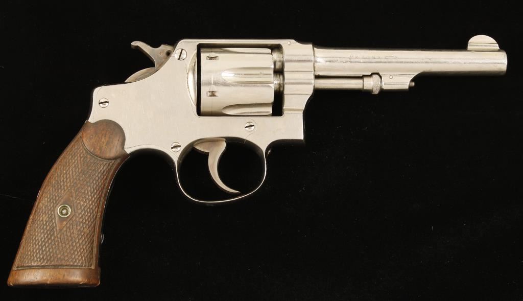 Nickeled double-action 6-shot revolver with a 4-1/4" barrel. Metal finish has some plating loss filed off above the strain screw on the front strap and small flaking at the muzzle with light scratches on much of the rest of the pistol. The trigger and hammer still have bright case coloring. There is a drag line. Checkered wood grips are worn with a small chip missing from one. Bore is bright and shiny with good rifling and the chambers are clean. Action doesn't rotate the cylinder in either double or single action mode. Condition is fair. *Modern Firearm*