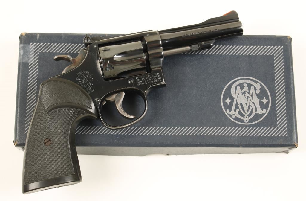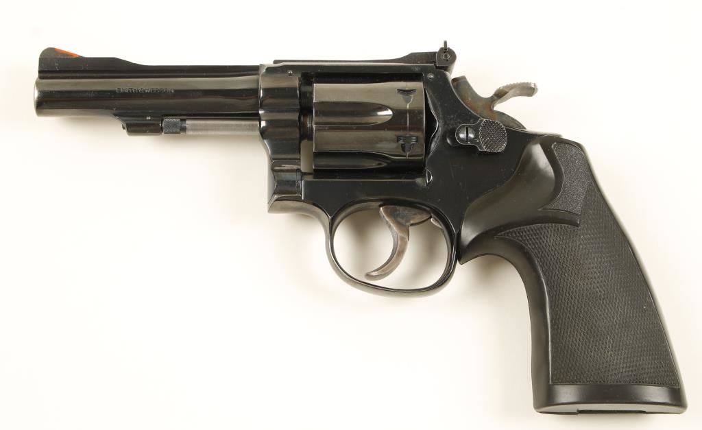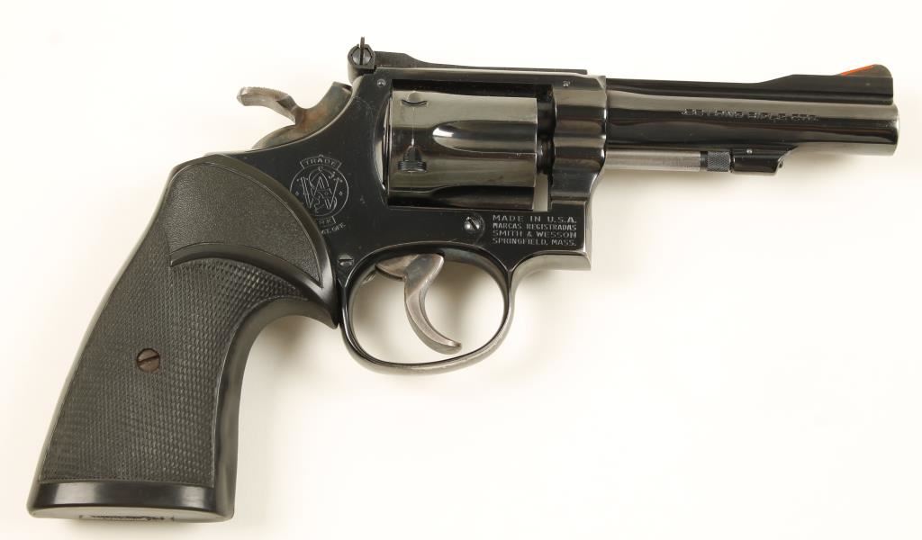 Combat Masterpiece. Blued double-action 6-shot revolver with a 4" barrel. Finish is in good condition with some scratches and a drag line. Target hammer and trigger still show case-coloring. Adjustable rear sight and the front sight has been machined to accept a plastic insert. Bore is mirror bright with strong rifling and the chambers are shiny. Action is smooth with good lock-up. Pachmayr Presentation grips are installed. Includes original box and instructions. Condition is very good. *Modern Firearm*