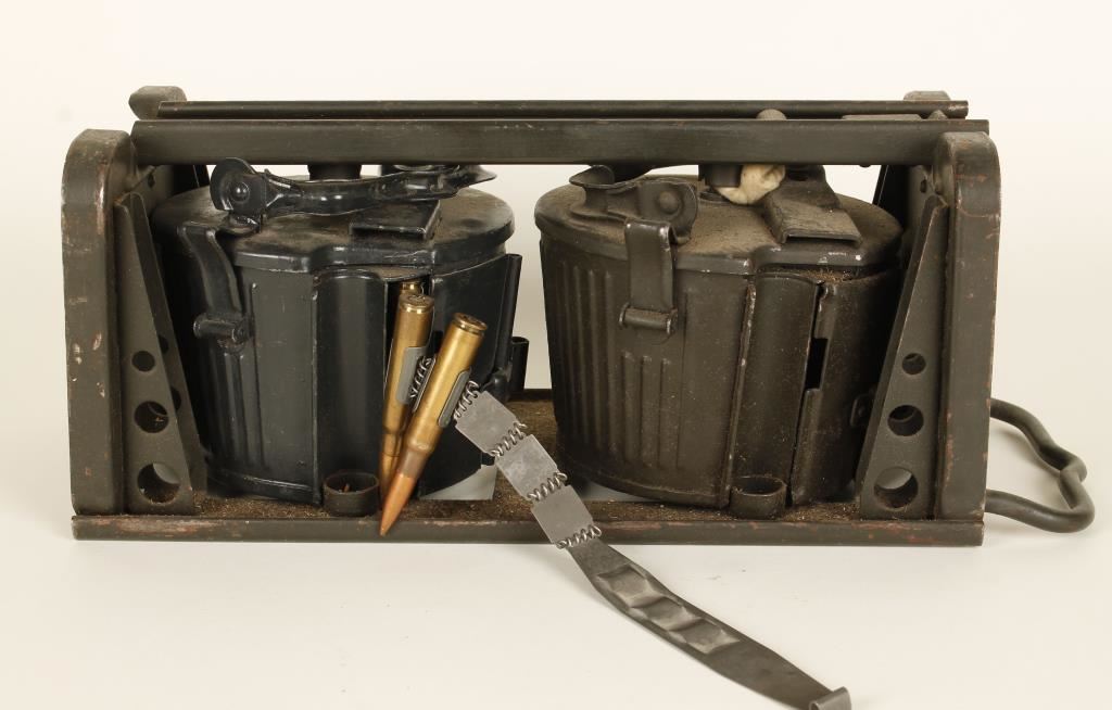 2 Drums with Carrier. Looks original, however unknown age with Loaded and Linked 7.62 ammo.