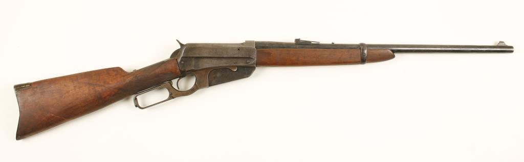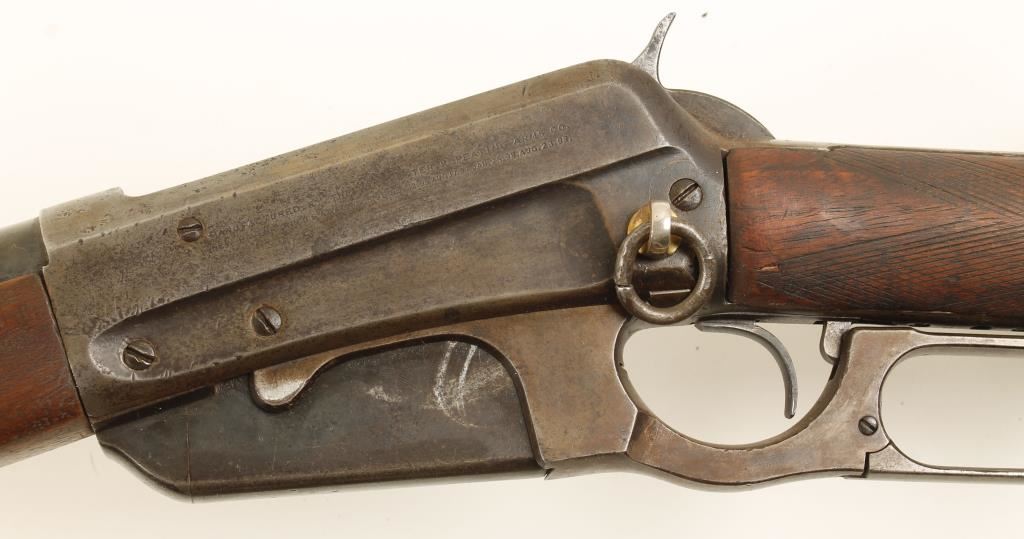 Lever-action blued sporting rifle with a 22" barrel and a replacement saddle ring stud. Rear sight is missing the ladder slide. Metal finish is fading with edge wear on the barrel and a grey patina on the receiver/lever. Tang screw is not correct. Plated bolt is showing some dings and rust spots. Crescent buttplate is dull bluing with edge wear. Wood rifle butt has worn checkering and scratches. Forend is ill-fitting with tight radius corners. It may be a replacement. Bore is frosty with good rifling. Action is working. Condition is fair. *Modern Firearm*