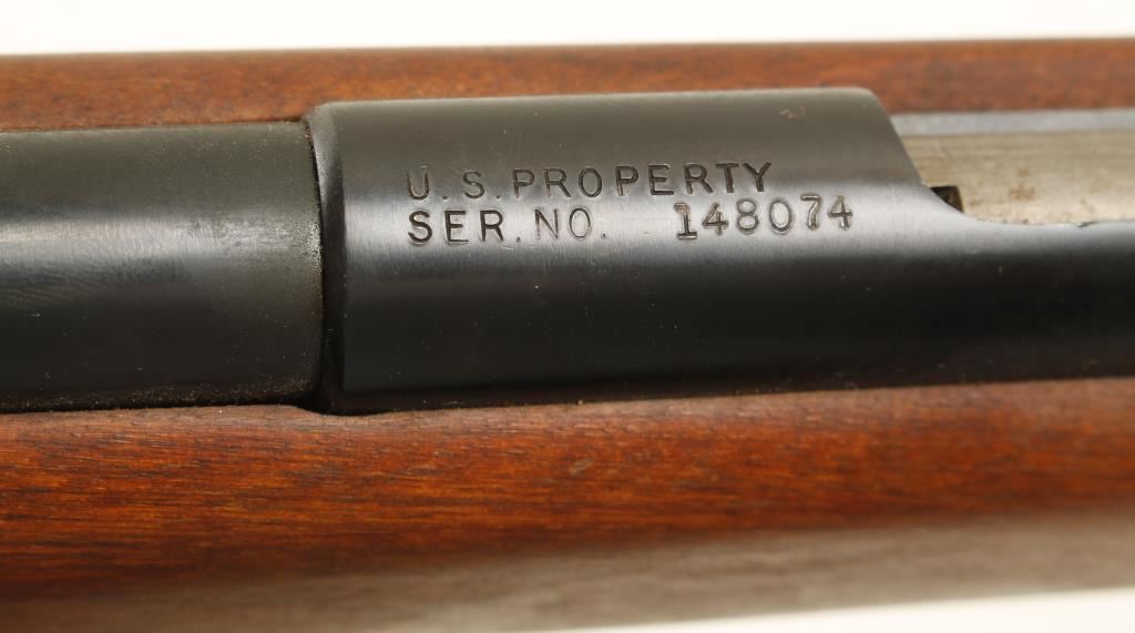 Blued bolt-action military target rifle with a 26" heavy no-taper bull barrel and one magazine. Marked "U. S. PROPERTY" on both the barrel and receiver. Bluing is in good condition with some edge wear and a few dings. Rear peep sight is adjustable for windage and elevation. Finger groove trigger guard is plastic. Serrated steel butt plate is matte finish with edge wear. Wood stock has some dings and dents. Bore is mirror bright. Action works well. Condition is very good. *Modern Firearm*