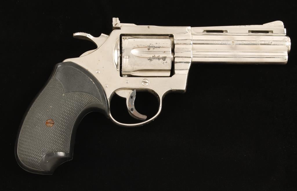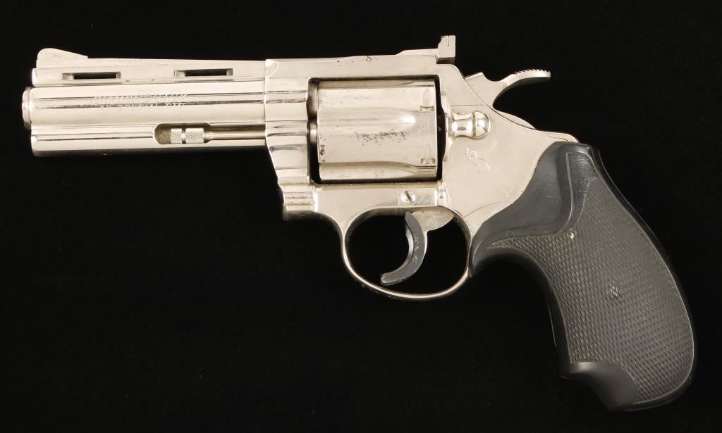 Re-nickel plated double-action 6-shot revolver with a 4" barrel with a ventilated rib and full underlug. worn and faded with some rust penetrations in the plating. Bore is bright with sharp rifling. The chambers are clear of any deficiencies. A trigger shoe has been installed. It has Pachmayr Compac grips in good shape. Condition is good. *Modern Firearm*