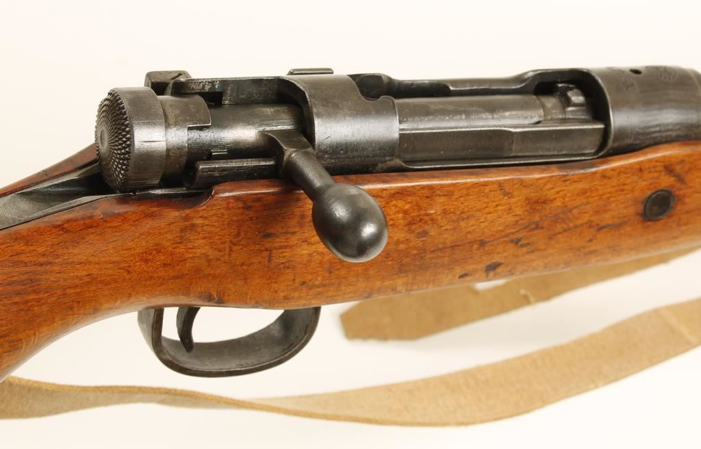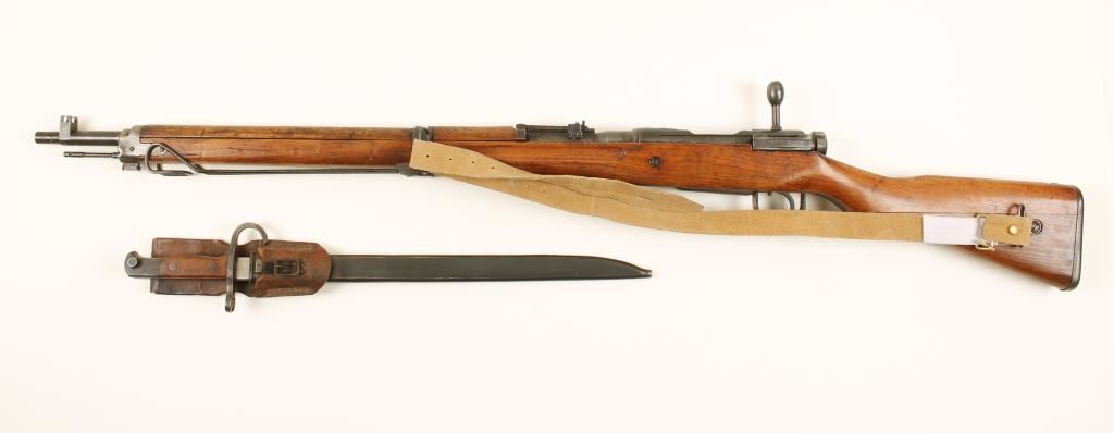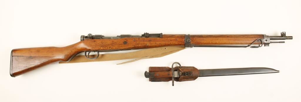 Japanese military blued bolt-action rifle with a 25-1/2" barrel, a monopod, a bayonet with scabbard and frog, and a fabric sling. "Mum" is intact. Bayonet has a 15-3/4" blade. Metal finish with pin-prick pitting and a few dings. Bottom metal has turned silver with light pitting and dings. Butt plate is grey with pitting. Wood is cracked along the joint in the butt. there are also many small dings and scratches. Bore is shiny with good rifling. Action works well. Condition is fair to good. *Modern Firearm*