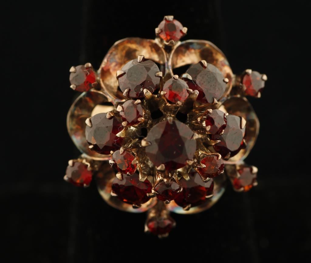 Vintage garnet ring in 14kt yellow gold. The garnets are lovely colors showing reds, golds, oranges and browns. There are 19 garnets all together consisting of seven 6mm garnets and twelve 3mm garnets, all composing a floral design. The garnets total approximately 8.5 carats. The ring had been "antiqued" meaning a solution was applied to darken the gold, some time back. The ring is size 7 1/4 & weighs 5.8 grams.
