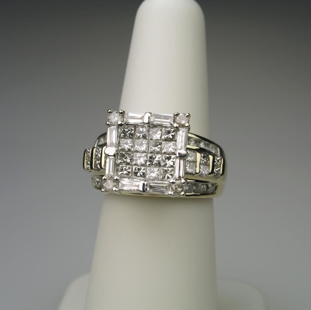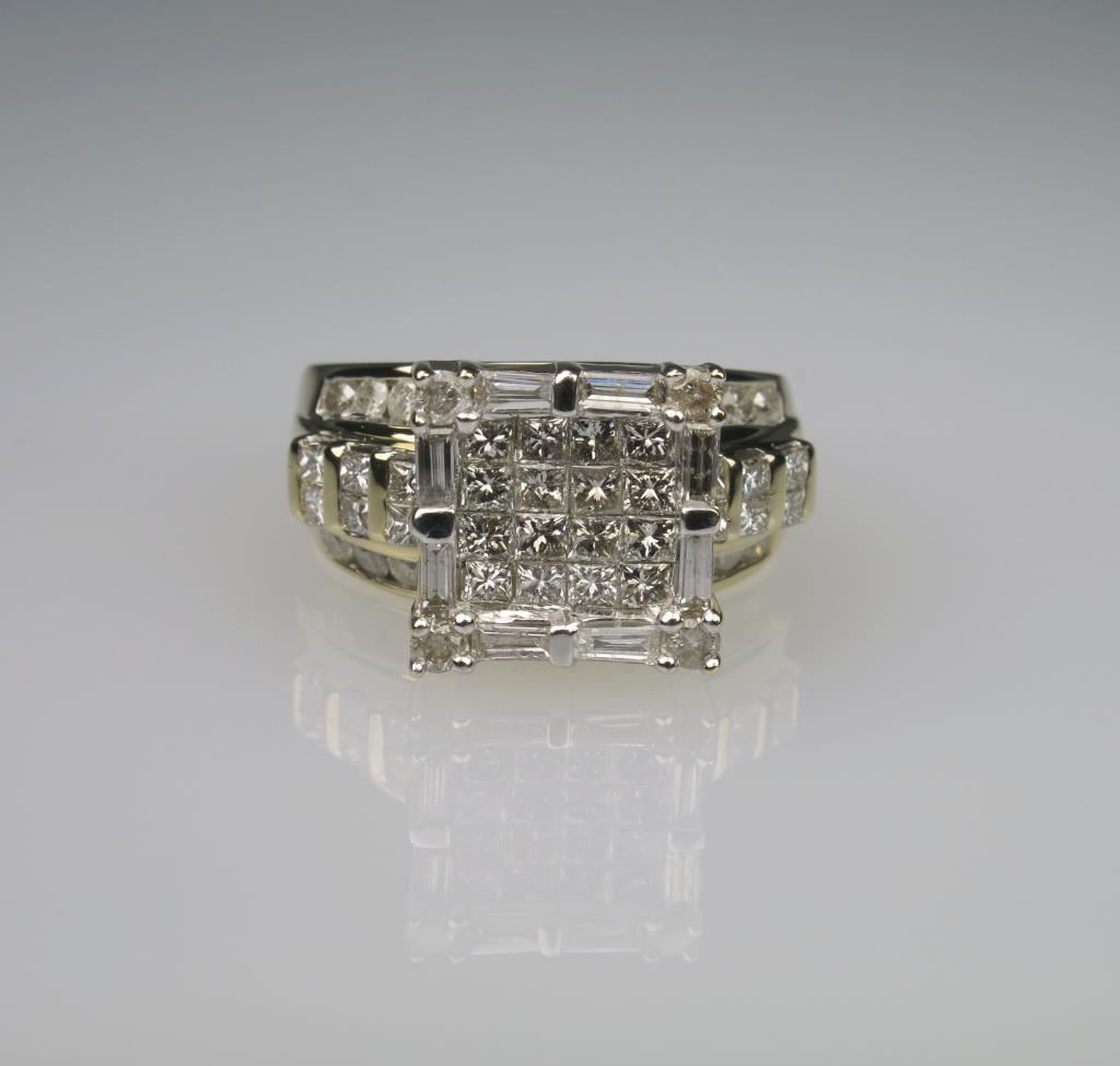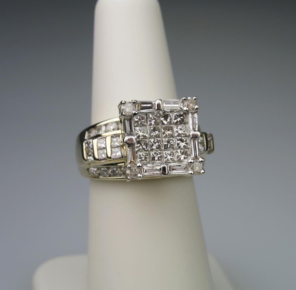 62 Diamonds in a beautiful combination of Princess, round and baguette cuts weighing approx. 3.00 carats total with G-H colors set in 9.4 grams of 14 karat yellow gold.