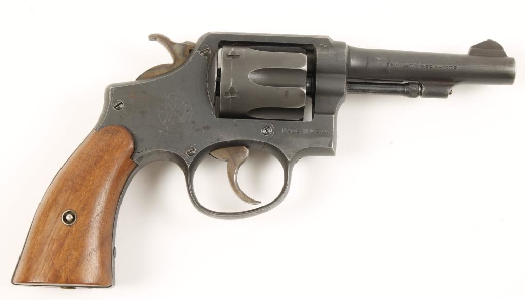Phosphated double-action 6-shot revolver with a 4" barrel. Finish has slight edge wear, a drag line, wear near cylinder latch and small freckles of rust. Stamped with flaming bomb proof and "U.S. Property G. H. D." Bore and chambers are shiny and there is sharp rifling. The smooth wood grips are in fine shape with a few dings. Case colored hammer and trigger still have bright areas. Function is smooth with good lock-up. Condition is good. *Modern Firearm*