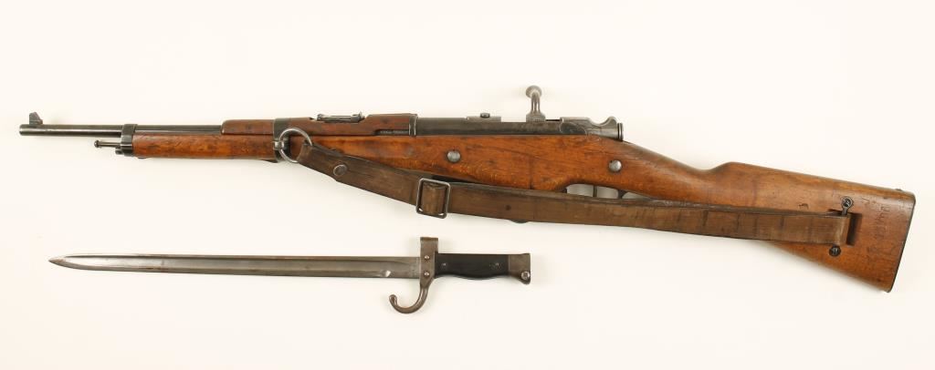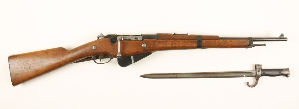 French military blued bolt-action carbine with a 17.7" barrel, a leather sling and a bayonet with a 15-9/16" blade. Metal finish is fading a little with edge and exposed surface wear, scratches and little bumps. Butt plate has faded to grey with rust stains. Wood has serial number stamped in it with a crack running through the rear cross bolt on the right side and from the upper tang above the rear cross bolt on the left. There is also a small crack running from the nose cap keeper. There are many dings, dents, scratches and scrapes. Bore is shiny with good rifling. Action is working well. Condition is fair.