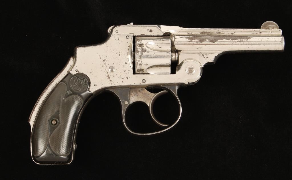 Nickel plated 1st model double-action only 5-shot top-break revolver with a 3" barrel. Nickel finish is dull with flaking and scratches. Color case hardened trigger still has some pale color to it. The trigger guard is blued and has gone dull. The hard rubber grips are worn smooth in spots and have a chip out of one and abrasions on the bottom. Function is smooth with good lock-up. The bore is dull with some pitting but has strong rifling. Chambers are in good condition. *Modern Firearm*