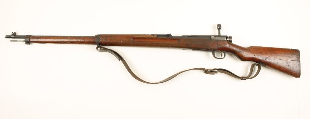 Japanese military blued bolt-action rifle with a 31" barrel, dust cover and leather sling. Metal finish has the "Mum" ground off with surface rust on the dust cover and trigger guard. Butt plate is black oxide pitted finish. Wood joint in buttstock is splitting and there are the many small dings and dents. Bore is frosty with good rifling. Action works well. Condition is good.