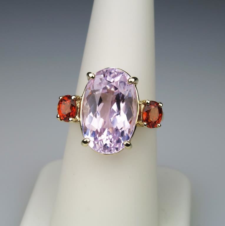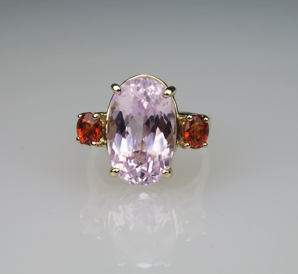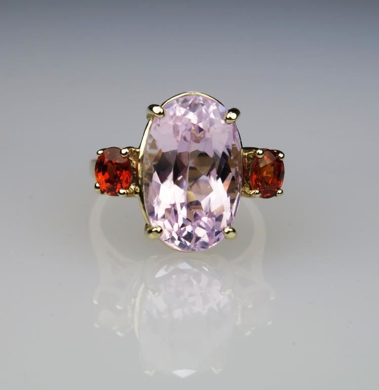 Pink Kunzite & Fine Orange Sapphire Ring. Lovely cushion cut Kunzite with 2 round cut Sapphires weighing 1.20 carats total set in 10 karat yellow gold.