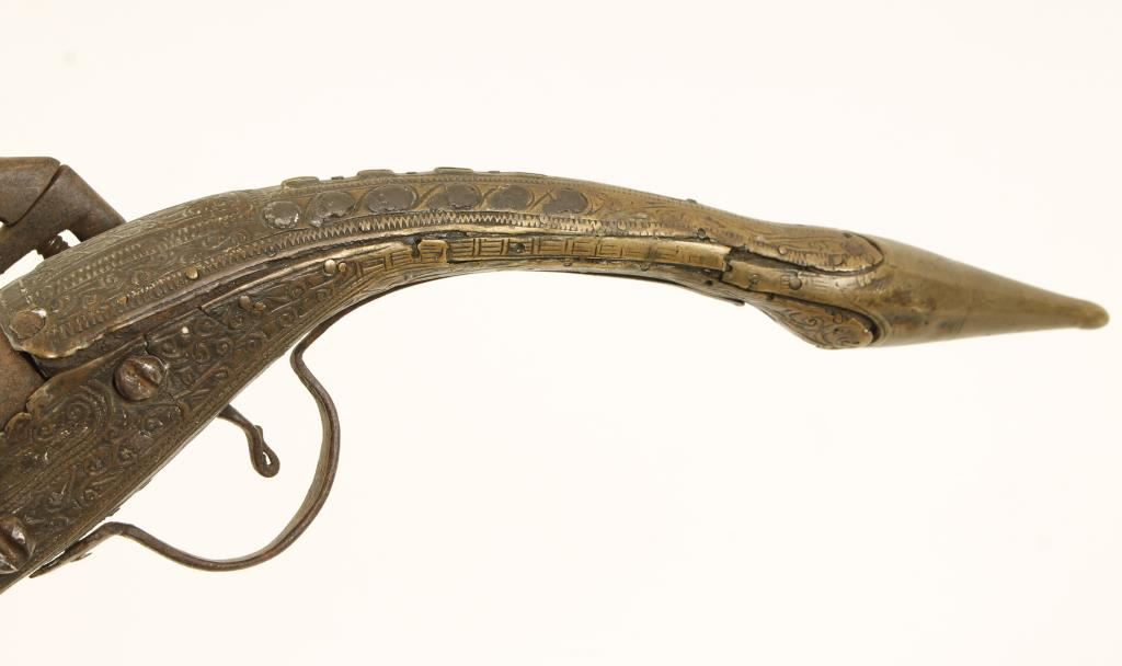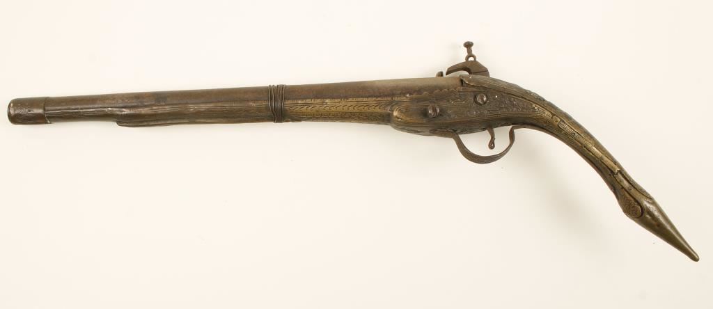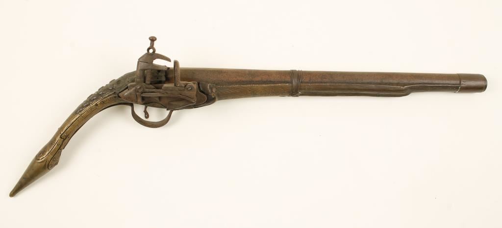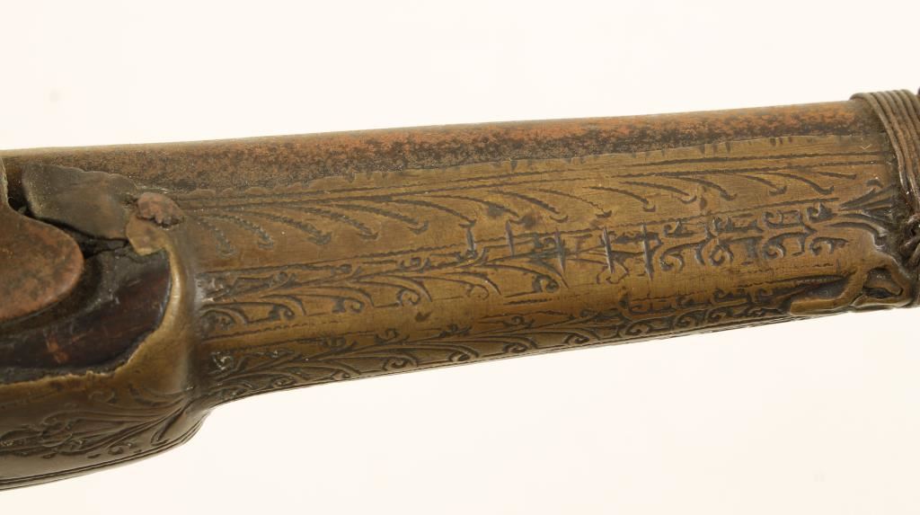 No Caliber, NVSN. Early Brass stocked flintlock which is engraved all over, barrel is wire wrapped and shows overall surface rust and age. Condition Fair for age missing some nails and shows rust. *Antique Firearm*