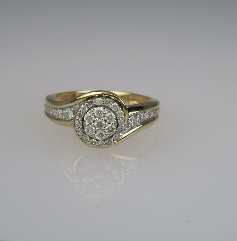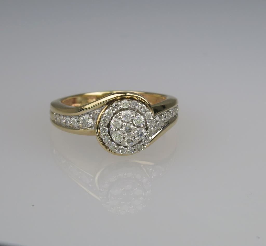 34 round cut Diamonds prong and channel set with approx. 0.60 carats total weight with G-H colors set in 10 karat yellow gold.