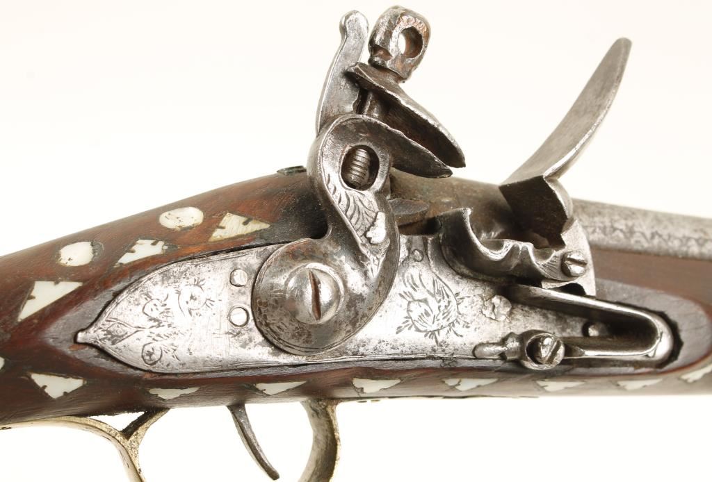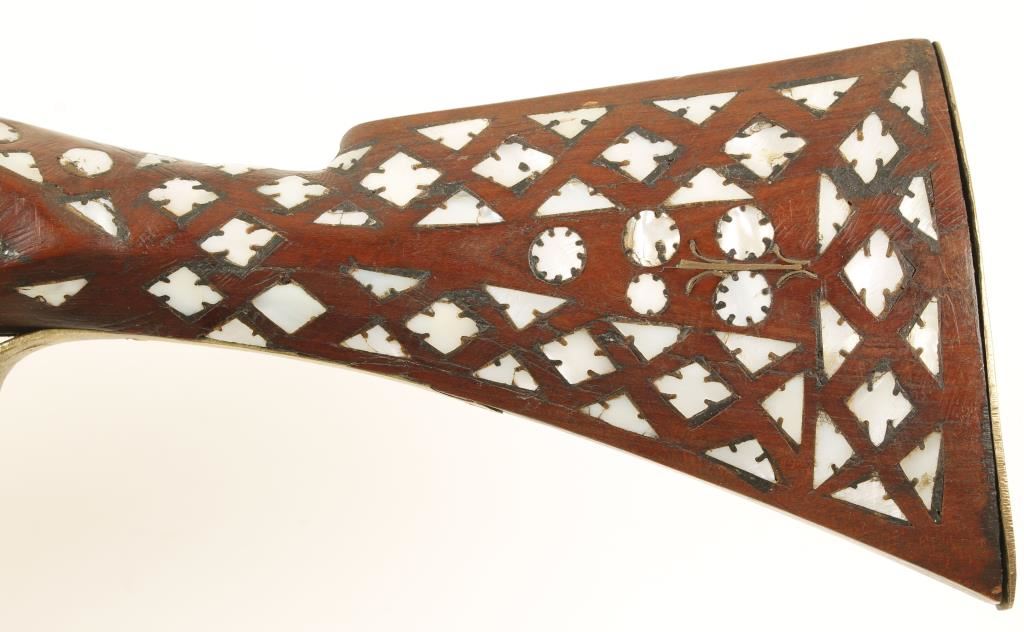 19th Century Type, Lightly engraved lock and tip of barrel. The stock is beautifully inlaid with mother of pearl in a floral type ornamentation. The trigger guard and butt plate are brass and appear to have been replaced. Also some of screws appear to be replaced. Condition overall Fair to Good as it is very old. *Antique Firearm*
