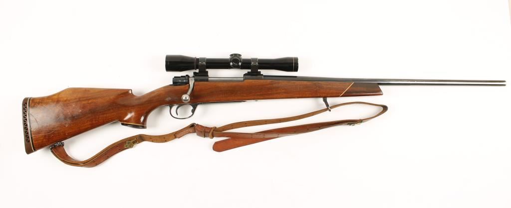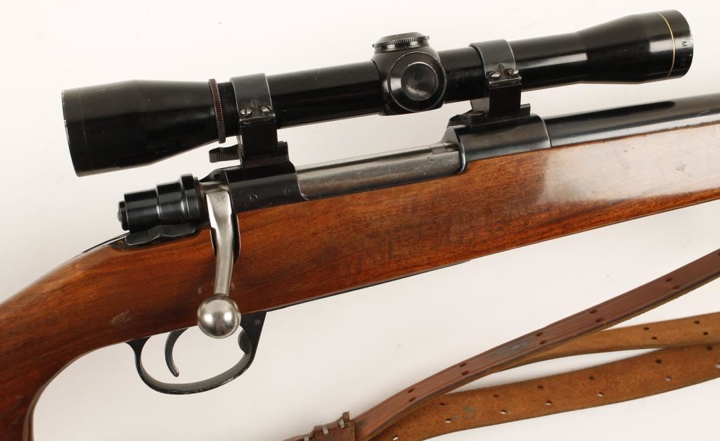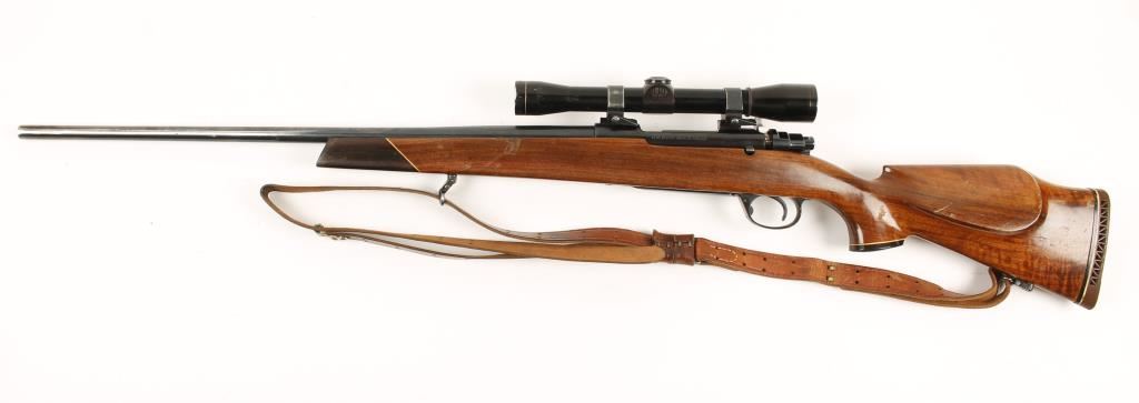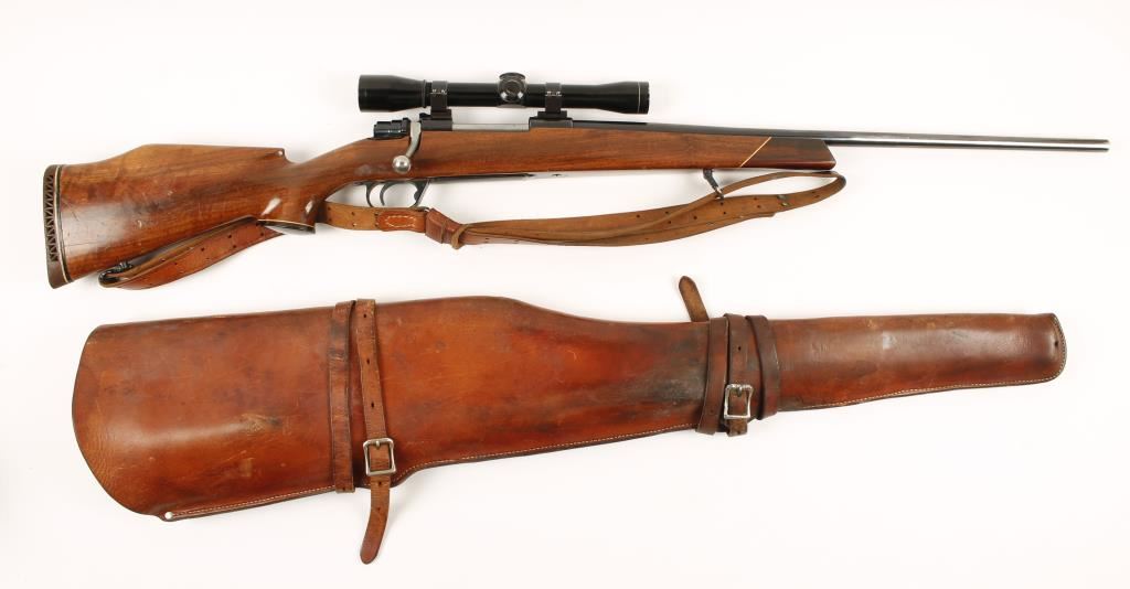 Modern commercial Mauser 98 action with a 24" Wilson Custom barrel with strong rifling and a bright bore. Comes with a Leupold M8-4X Scope, a sling and a leather saddle scabbard. The bluing shows some small scratches and scabbard wear on the barrel. The receiver and bolt shroud are in good condition. The in-the-white bolt handle has some fine pin prick pitting. The scope shows edge wear on the bells and turrets. The last lens on the scope is scratched. There are Leupold detachable scope rings. The non-ferrous hinged floor plate and trigger guard have edge wear to their finish. The walnut Monte Carlo stock has many dings and rubs with a few that are large and deep. Action is fine. The scabbard is a Heiser-Keyston-Lichtenberger 68 S. Condition is fair to good. Modern Firearm*