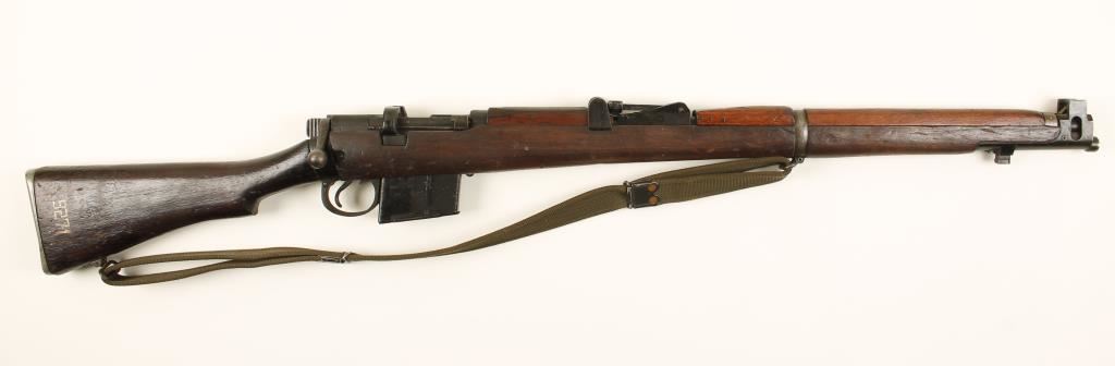 Indian made British military blued bolt-action rifle with a 25-1/8" barrel and a web sling. Metal finish is paint over bluing with edge wear to bare metal. Butt plate is an alloy with a trapdoor and nothing in the space. Wood is dark with a number stenciled on the butt, a large "X" scratched in, white paint spatters and dings, scrapes and gouges. Forend and hand guards have different finishes with few dings and scratches. Bore is shiny with good rifling. Action is working well. Condition is fair to good. *Modern Firearm*