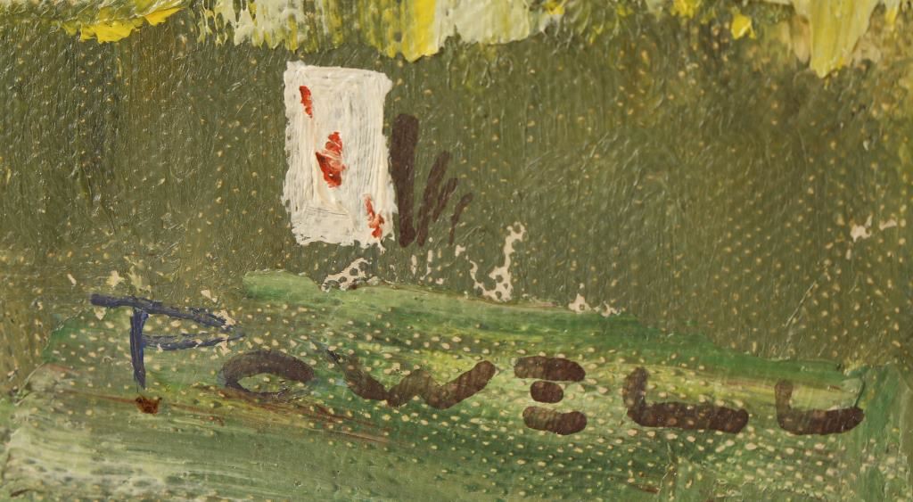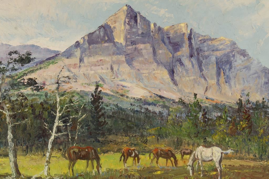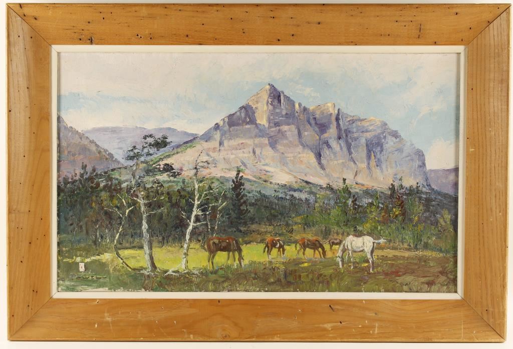 by noted Montana artist Ace Powell. Entitled 'Appecunie Ridge'. Depicting horses grazing. Framed and signed on the lower left by Powell with his signature playing card. Measures 29"x17"