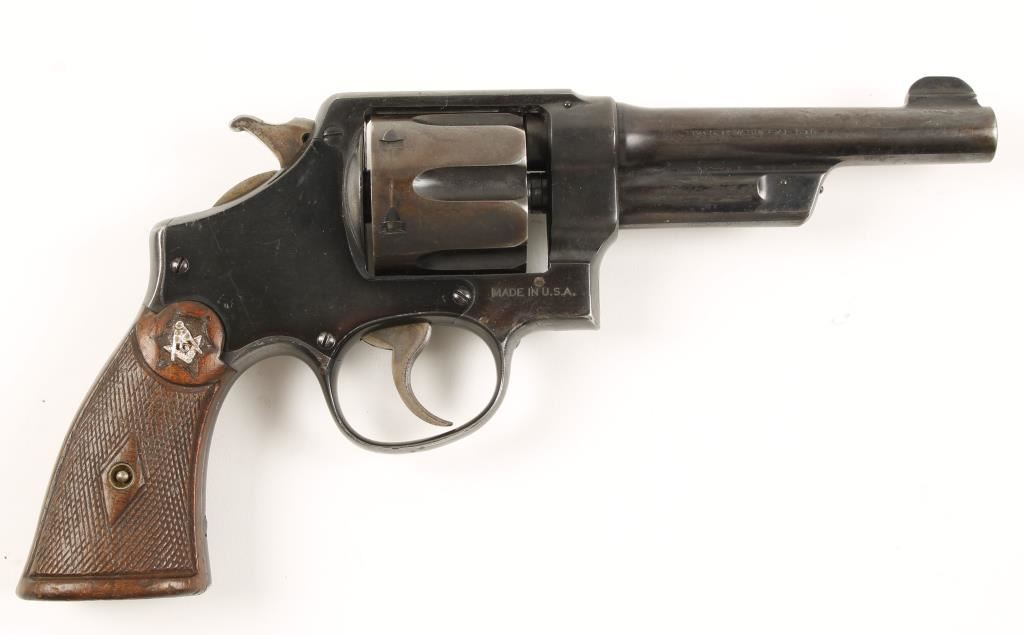 Double action revolver with a 5" barrel with a bright bore that shows good rifling. Bluing is showing holster and edge wear with isolated areas of light pitting and fading or discoloration. Wood diamond grips are worn and the left grip has a S&W medallion but the right grip has a Masonic symbol where the medallion should be. Action performs well and the lock-up is good. Condition is fair to good. *Modern Firearm*
