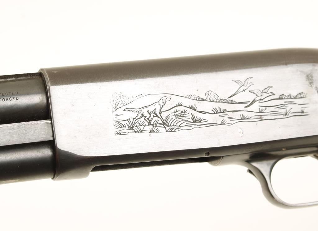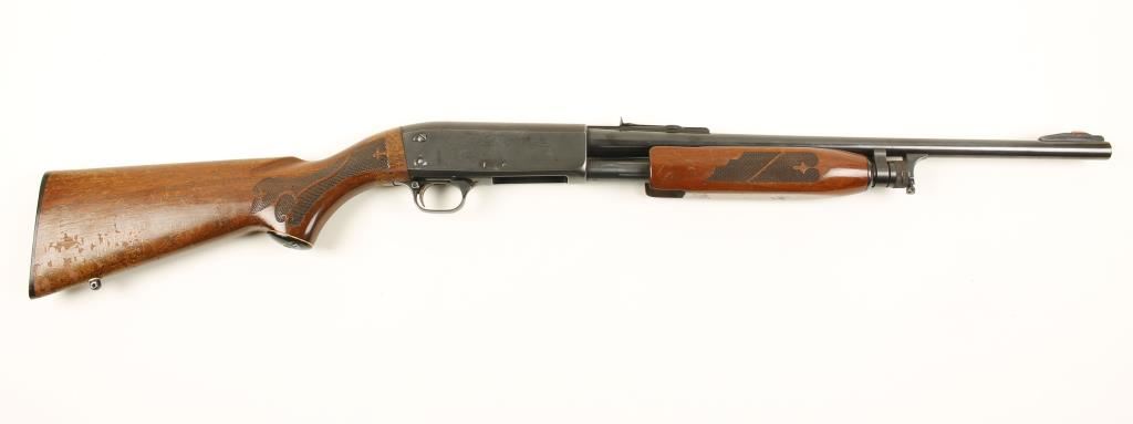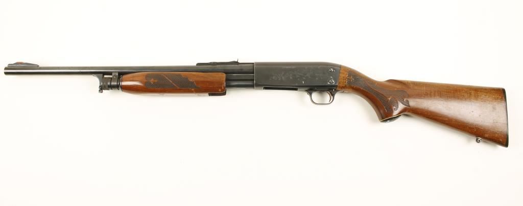 Blued pump-action shotgun with a 20" 2-3/4" chamber smoothbore barrel equipped with rifle sights. Metal finish has light freckling of surface rust and a few dings. Varnish on the butt stock is crazed and flaking off. Factory plastic butt plate has a few tiny chips on the edges. Forend has some scrapes and dings. Bore is shiny and may clean to better. Front sight blade is battered. Action is smooth. Condition is good. *Modern Firearm*