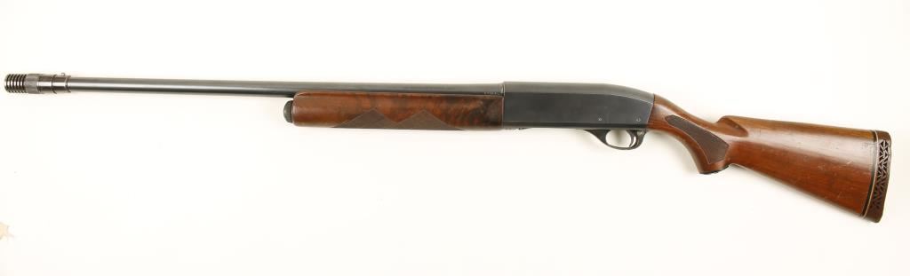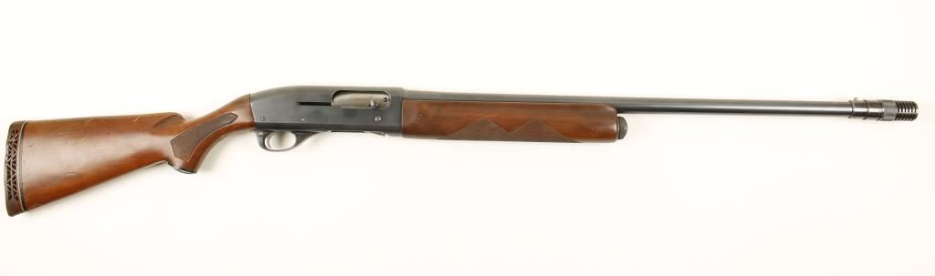 Blued semi-automatic shotgun with a 27-1/2" barrel chambered for 2-3/4" shells and with a Poly-Choke compensator. Bluing has edge wear, scratches with surface rust dulling and pin-prick pitting. Recoil pad has ossified. Wood has checkering with some wear and scratches, dings and rubs. Bore is mirror bright. Action is good. Condition is good. *Modern Firearm*