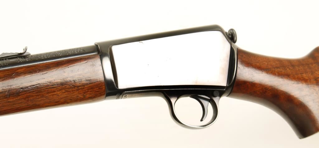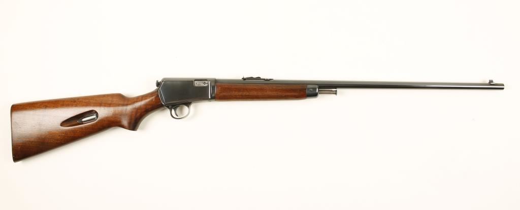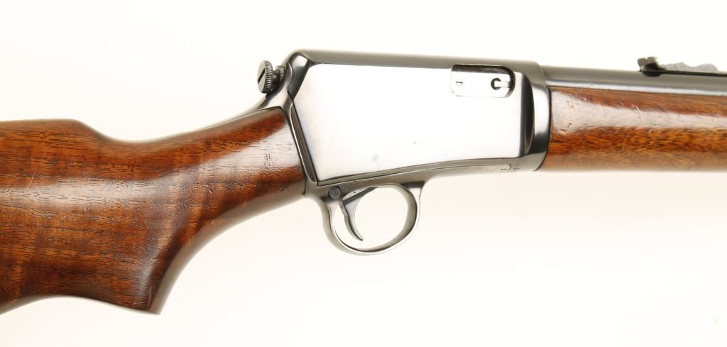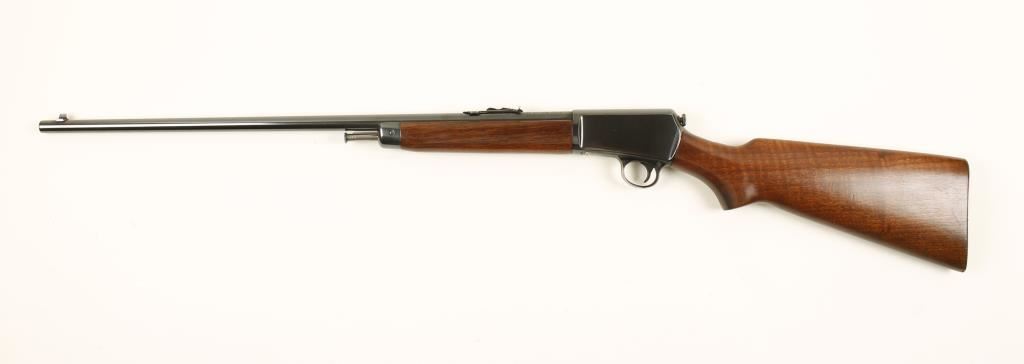 Blued semi-automatic take-down rifle with a 23" barrel. Bluing is near mint with only a few tiny scratches on the barrel and receiver and wear to the front of the bottom metal, trigger guard and the upper tang. Receiver and barrel may be re-blued. Wood is in very nice condition with a few dings and rubs. Forend is a little loose. Bore is very good. Action works well. Condition is very good to excellent. *Modern Firearm*