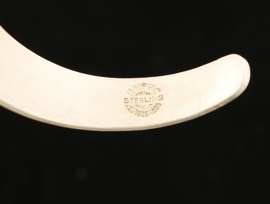 1950's Fred Harvey era cuff from Maisel's Indian Trading Post. Maisel's was founded in Albuquerque in 1939 by Maurice & Syma Maisel to cater to the new Route 66 tourist trade. The trading post employed hundreds of native craftspeople in its heyday. The cuff is relatively simple and light which was typical for that time period-tourists didn't want to pay much for a souvenir to take home from their travels. The cuff is hallmarked with the Maisel's circular hallmark and Sterling.