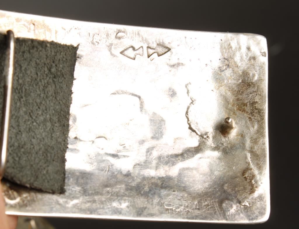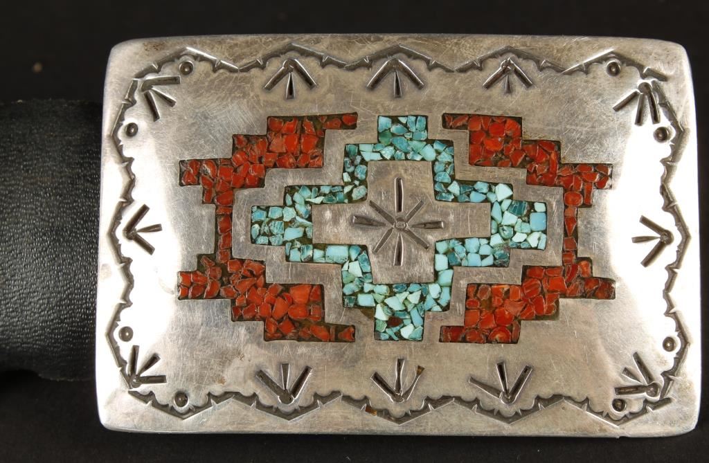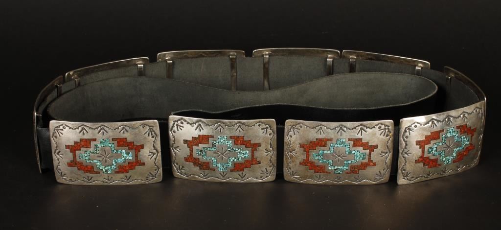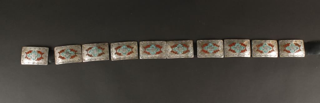 inlaid with turquoise and red coral with geometric design. By well known silversmith Willie Singer. 10 rectangular conchos on black leather belt.