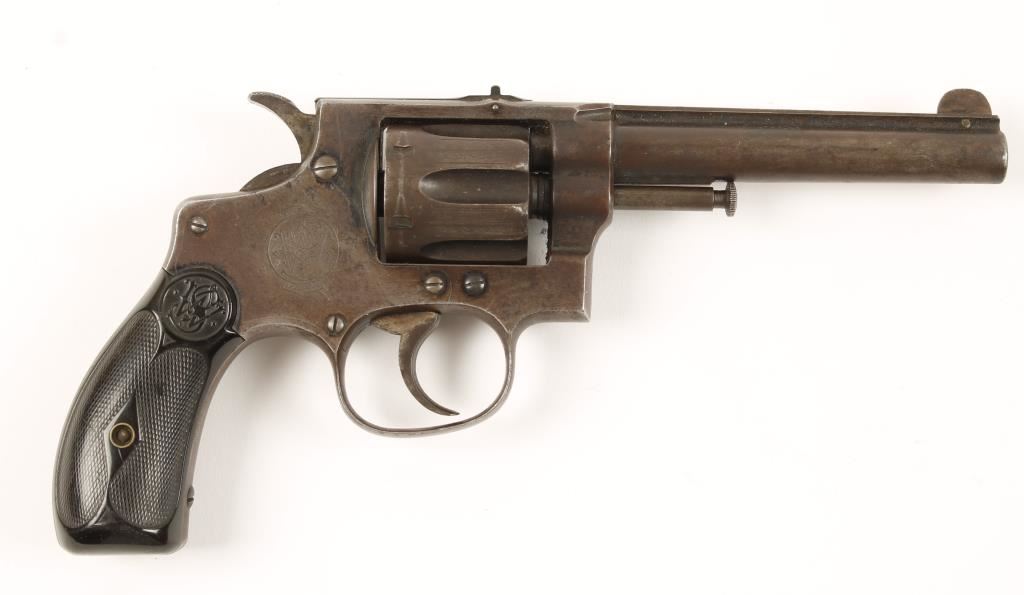 First model hand ejector double action I-frame revolver. 4-1/4" barrel with some rifling in a pitted corroded bore. Originally a blued finish now faded to a mottled brown with bluing in the protected areas. Roll stamping on cylinder and frame is sharp. Function is good with tight lock-up. Grips are black hard rubber with a piece missing out of the bottom of the left grip. Condition is good. *Modern Firearm*