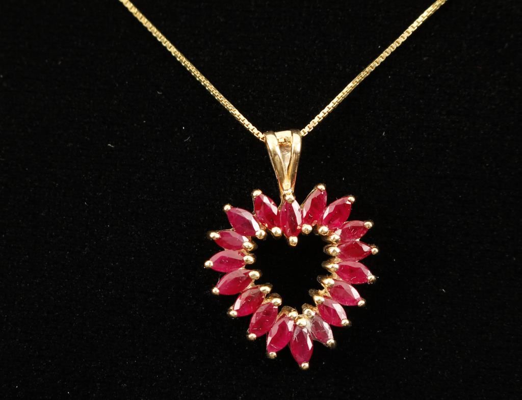 Adorable heart pendant adorned with 18 marquise cut rubies. The rubies are a lovely deep color and total about 2.3 carats-all in 10k yellow gold. The pendant is suspended from an 18 1/2" 10k chain. Show her how much you love her with this enduring symbol of your love.