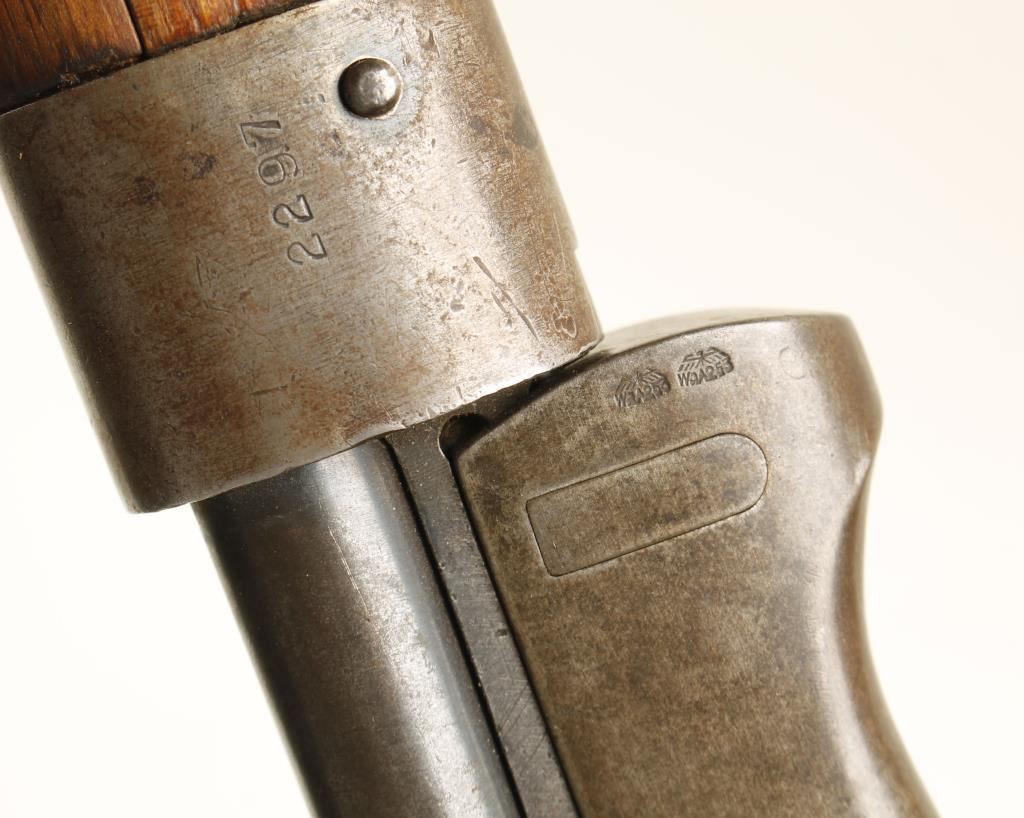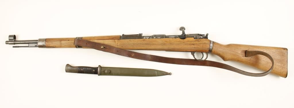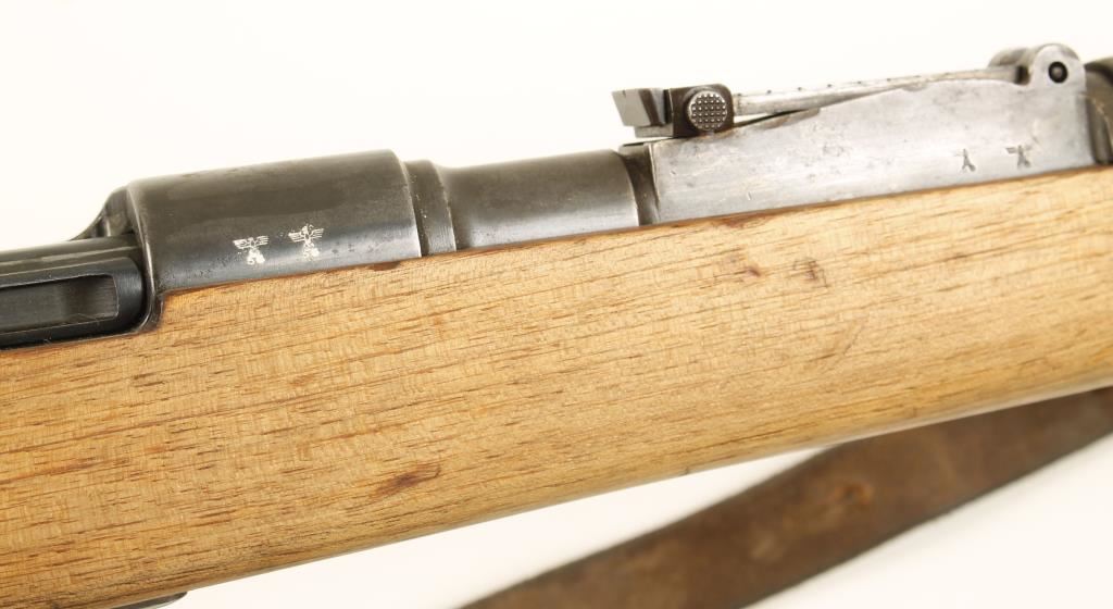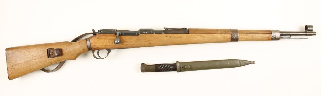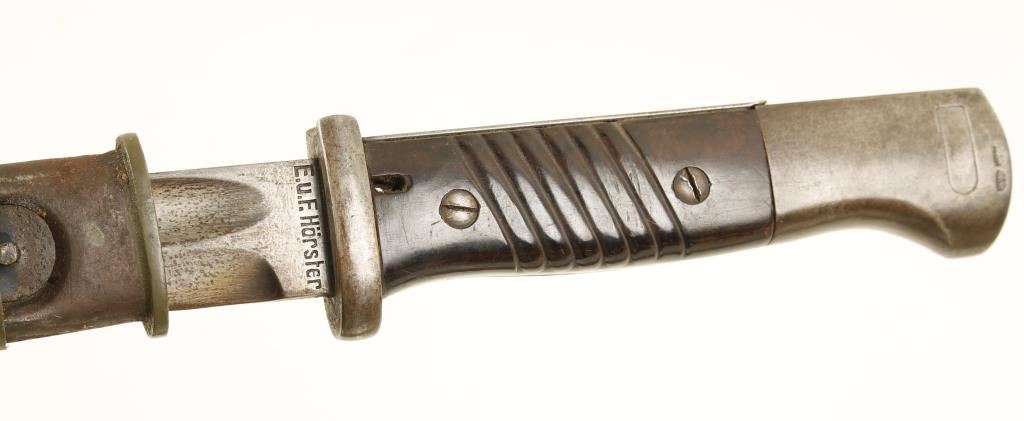 Hungarian made for Nazi Germany. Blued military bolt-action rifle with a 23.6" barrel. Bluing is fading to a silvery finish with rust stains. There are waffenamts all over. Bolt, bottom metal floor plate and bolt stop serial numbers don't match stock, barrel bands, receiver and barrel. Buttplate has been worn to silver color. Wood may have been stripped and has little visible damage. Action works well. Bore is dark with rifling. Includes a bayonet with scabbard. Condition is fair. *Modern Firearm*