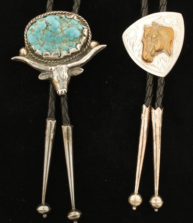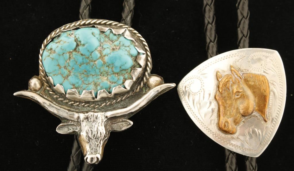 One bolo was crafted by a Comstock Silversmith and features a 'gold washed' horse head on an engraved silver crest. The other bolo is a large egg shape turquoise stone encircled by an engraved rope design and mounted above a big horn Texas steer head. Both bolos are in excellent condition.