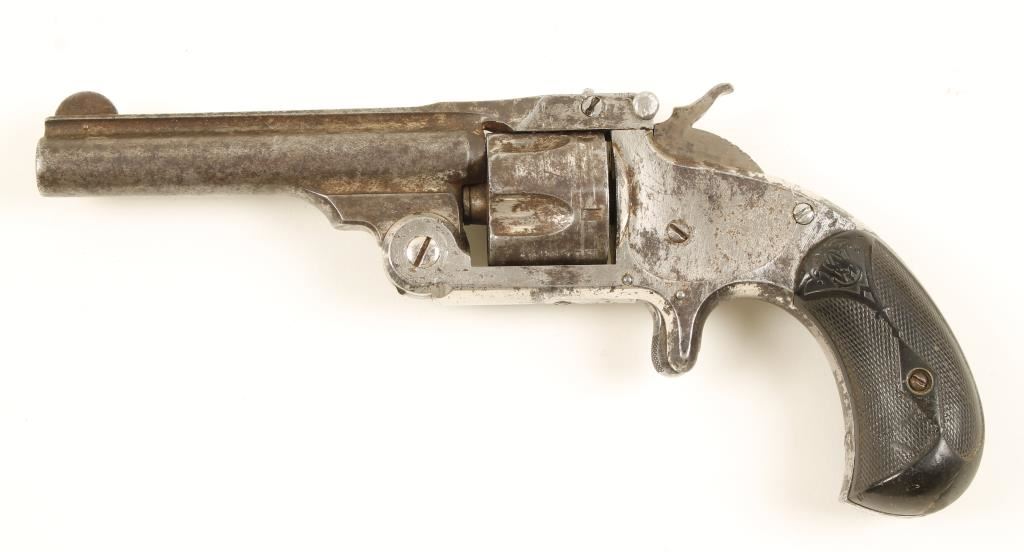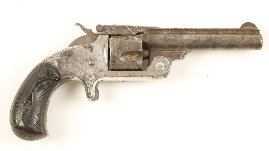 Nickeled single-action 5-shot spur-triggered top-break revolver with a 3-1/2" barrel with top rib. Approx. 40% plating remains with dark patina from surface rust and pin-prick pitting on the exposed steel. Bore is shiny with rough areas from pitting. Chambers also have pitting in them. Action doesn't work, trigger doesn't reset forward and locking bolt doesn't descend. Hard rubber grips have epoxy repairs and are worn almost smooth in spots. Condition is poor.