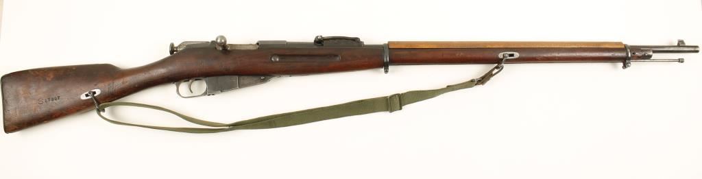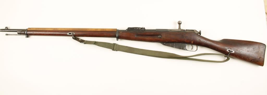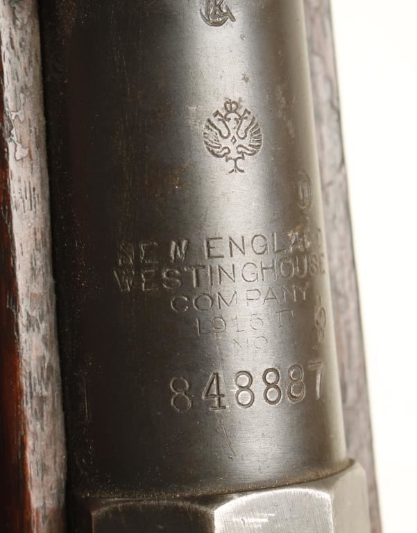 US made blued Russian military rifle with a 31-1/2" barrel. Stamped "New England Westinghouse Company". Bluing has edge wear and has worn to bare metal in spots. Butt plate is mostly bare metal with pitting. Import marked. Serial numbers do not match on receiver, bottom metal, buttplate and bolt. Stock has an illegible round cartouche and "S17237" stamped on the right side of the butt. Wood is dark with many dings, dents and a chip at the toe of the buttplate. Hand guard does not match rest of stock. Action works well. Bore is frosty with worn rifling. Condition is fair. *Modern Firearm*