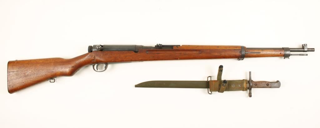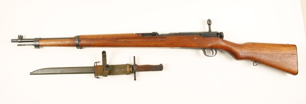 Blued Japanese military bolt-action rifle with a 25-1/4" barrel. The "Mum" has been ground off but the dust cover is intact. Bluing is in good shape with some rust stains. Wood stock has split along the joint of the buttstock at the butt plate. There are dings, dents and scratches. Includes a bayonet with scabbard and webbing frog. Action works well. Bore is frosty with strong rifling. Condition is good. *Modern Firearm*