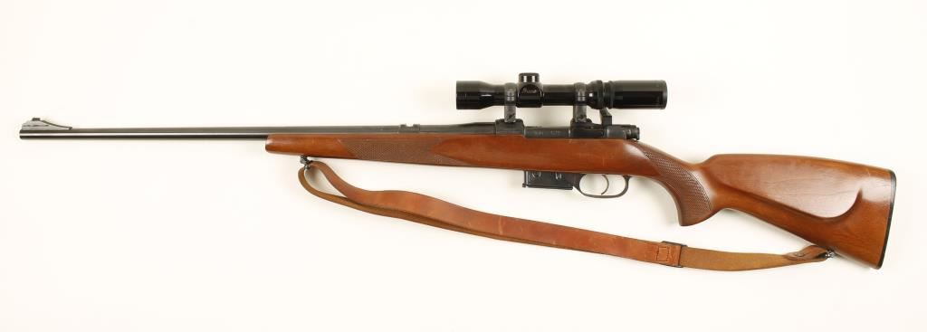 Blued bolt-action varmint rifle with a 23-3/4" barrel, a Burris scope and one magazine. Bluing is very good with a few specks of surface rust. Wood "hogs back"stock is checkered and has scratches and dings. Bore is bright and shiny. Action works well. Scope is a 2-7 power compact. Includes a leather sling. Condition is very good. *Modern Firearm*