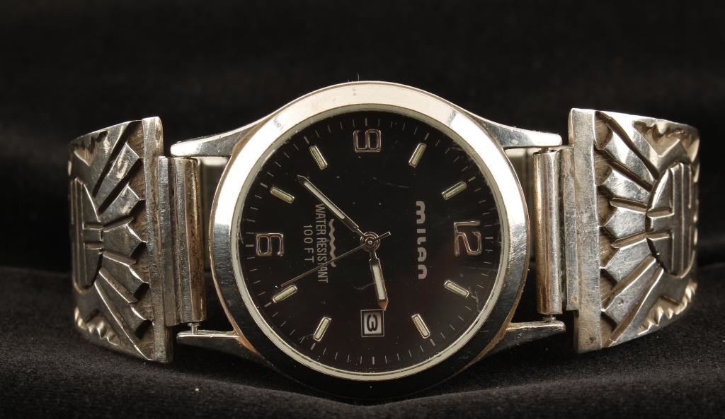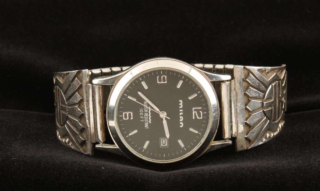 Very masculine watch band by Darin Bill who is a famous Navajo artist with a very recognizable style. He only creates "heavy" bracelets, which is why he is popular for men's jewelry. Darin Bill passed in May of 2003. The watch tips are made with a technique called overlay, the design is reminiscent of both Zuni and Hopi styles. Included is a Milan watch with a black face.
