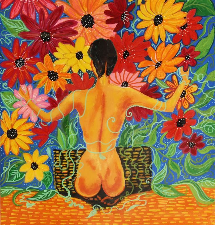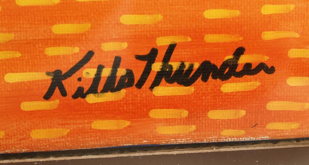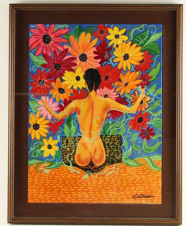 Shows the back of a seated nude figure with brightly colored flowers surrounding her. Signed Kills Thunder, measures 23" x 29". Kathleen was born in 1947 in Seattle Washington. Her Father Ben Kills Thunder was a Sioux Indian from the Fort Peck Indian Reservation in Northeast Montana. Kathleen is well known for her painting and beading, always done in a bright colorful way. She currently lives in Southeast Arizona and raises buffalo and continues to produce beautiful art.