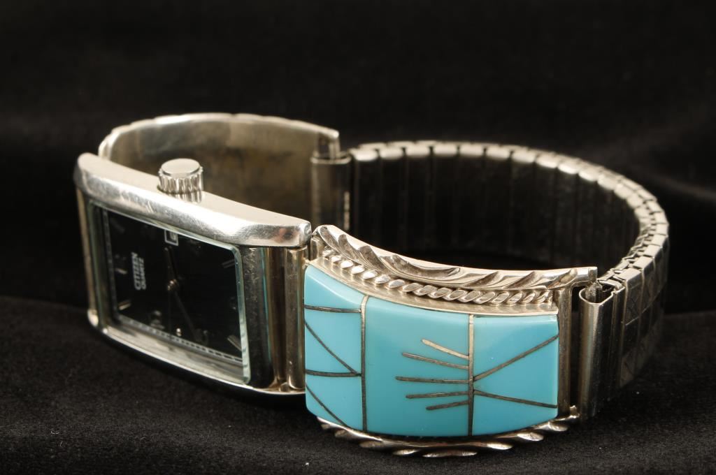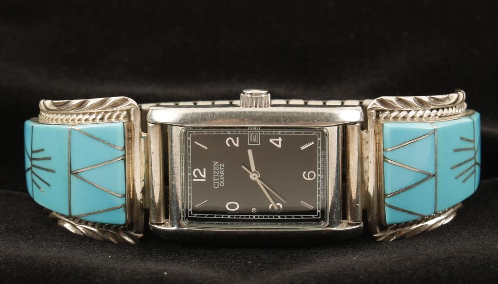 Extremely well made watch tips by Navajo artist Charles Willie who is known for his extremely well made gemstone inlay work. Charlie started creating jewelry in the 1980's and has been a smith for Sunburst Handcrafts since 1981. The tips consist of lovely turquoise intricately inlaid into the sterling silver. The tips are hallmarked "CW Sterling". Included is a Citizen quartz watch with a black face in very good working condition.