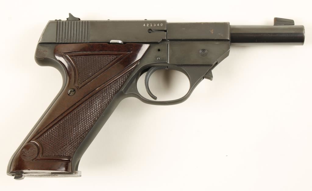 Blued semi-automatic pistol with a 4" interchangeable barrel and one magazine. Metal has a few scratches and a few spots of surface rust with pitting. Plastic grips have a thumb rest for a right-handed shooter and are in good condition. Bore is mirror bright with rifling. Action works well. Condition is good to very good. *Modern Firearm*