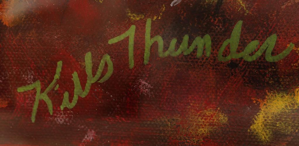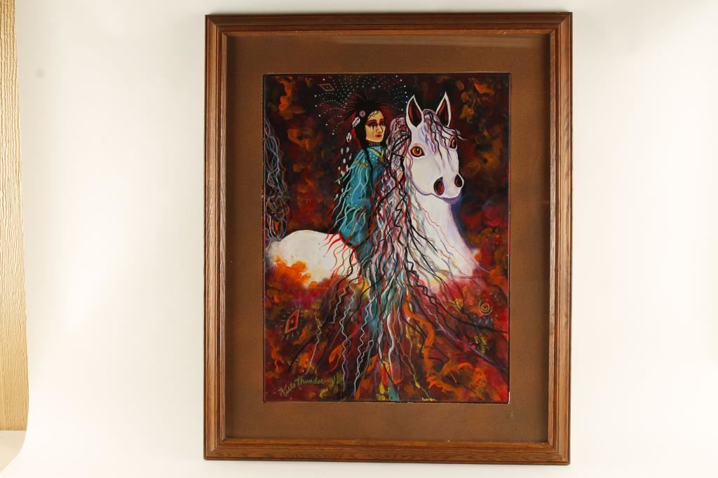 depicting a Native American Woman on a white horse by Kathleen Kills Thunder. Behind glass, signed Kills Thunder, measures 27"x33".