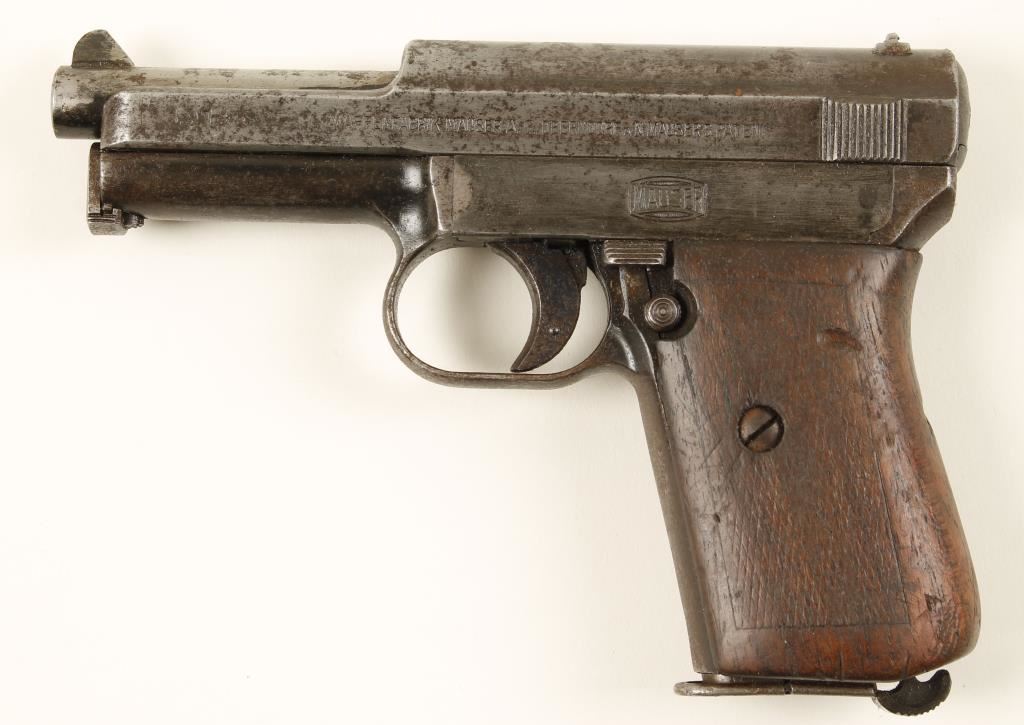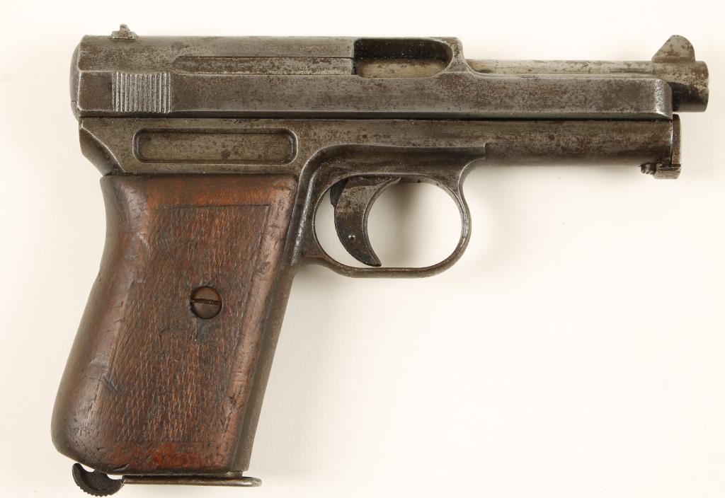 Blued semi-automatic hammerless pistol with a 3-1/2" barrel and one magazine. Metal finish has faded to almost bare metal with lots of rust stains and some pitting. Barrel number doesn't match the receiver/slide number. Wood wrap-around grip has dings, scratches and a chip missing with the checkering almost worn smooth. Bore is shiny with little rifling. Action works well. Condition is fair. *Modern Firearm*